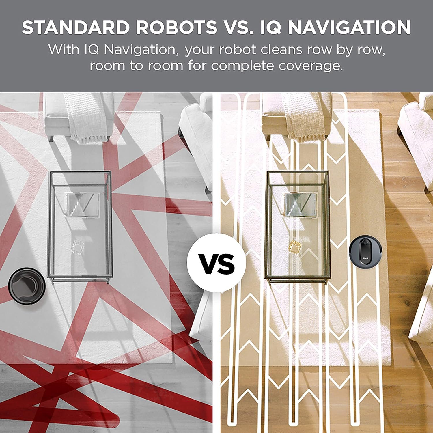 ROW-BY-ROW CLEANING: Methodically cleans row-by-row and then navigates room-to-room for complete home coverage.