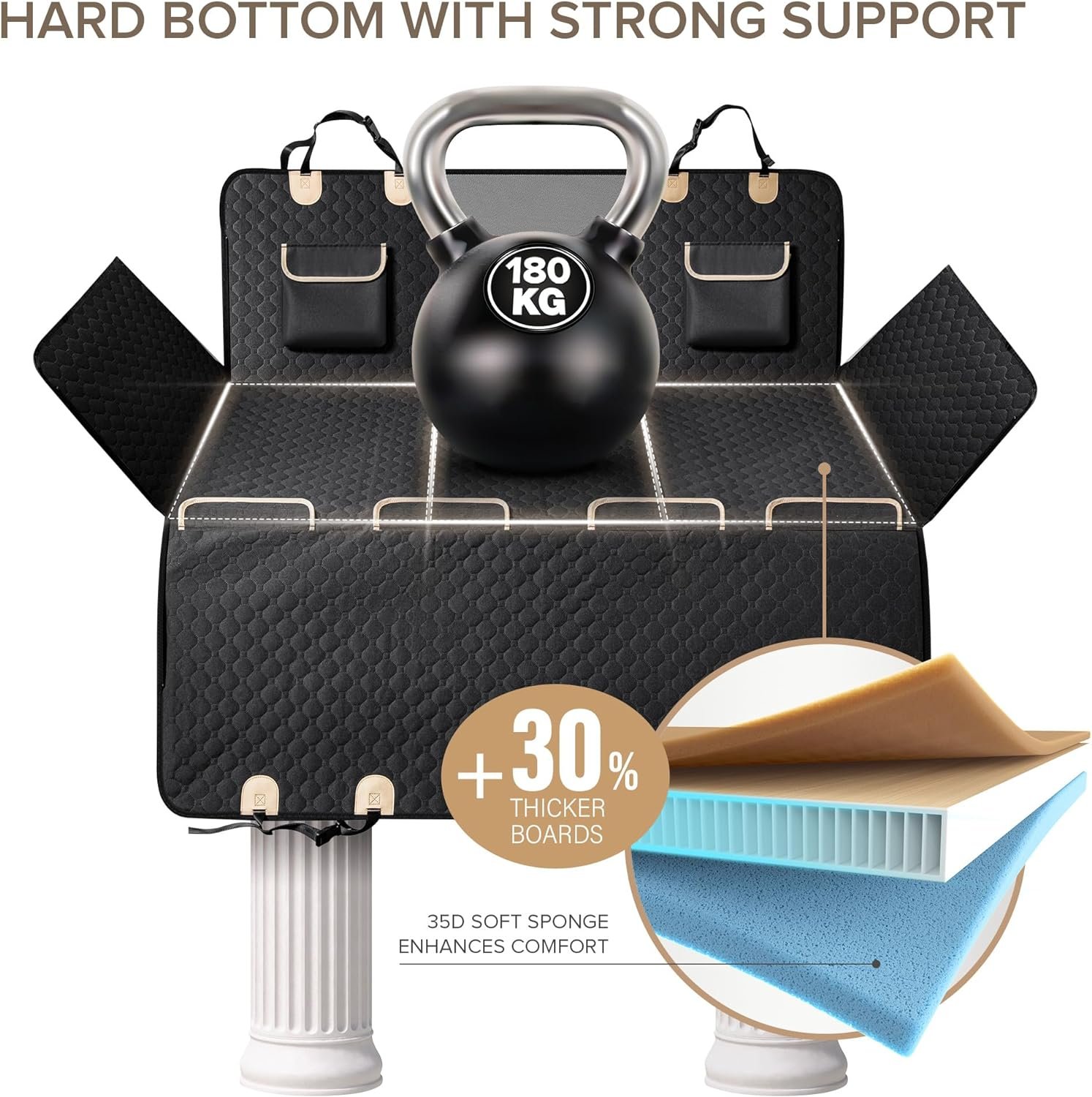 HARD BOTTOM CAR SEAT COVER FOR DOGS GET 99.9% SPACE UTILIZATION – Hard bottom creating nearly 40% extra flat space to enhance your pickup truck’s backseat area. Dog hammock for truck features three extra sturdy boards, allowing dog to move freely and stretch out comfortably at all rear spaces during rides. With four side flaps acting as safeguards, your pet can stay secure when sudden stops, ensuring a worry-free journey for both you and furry friends