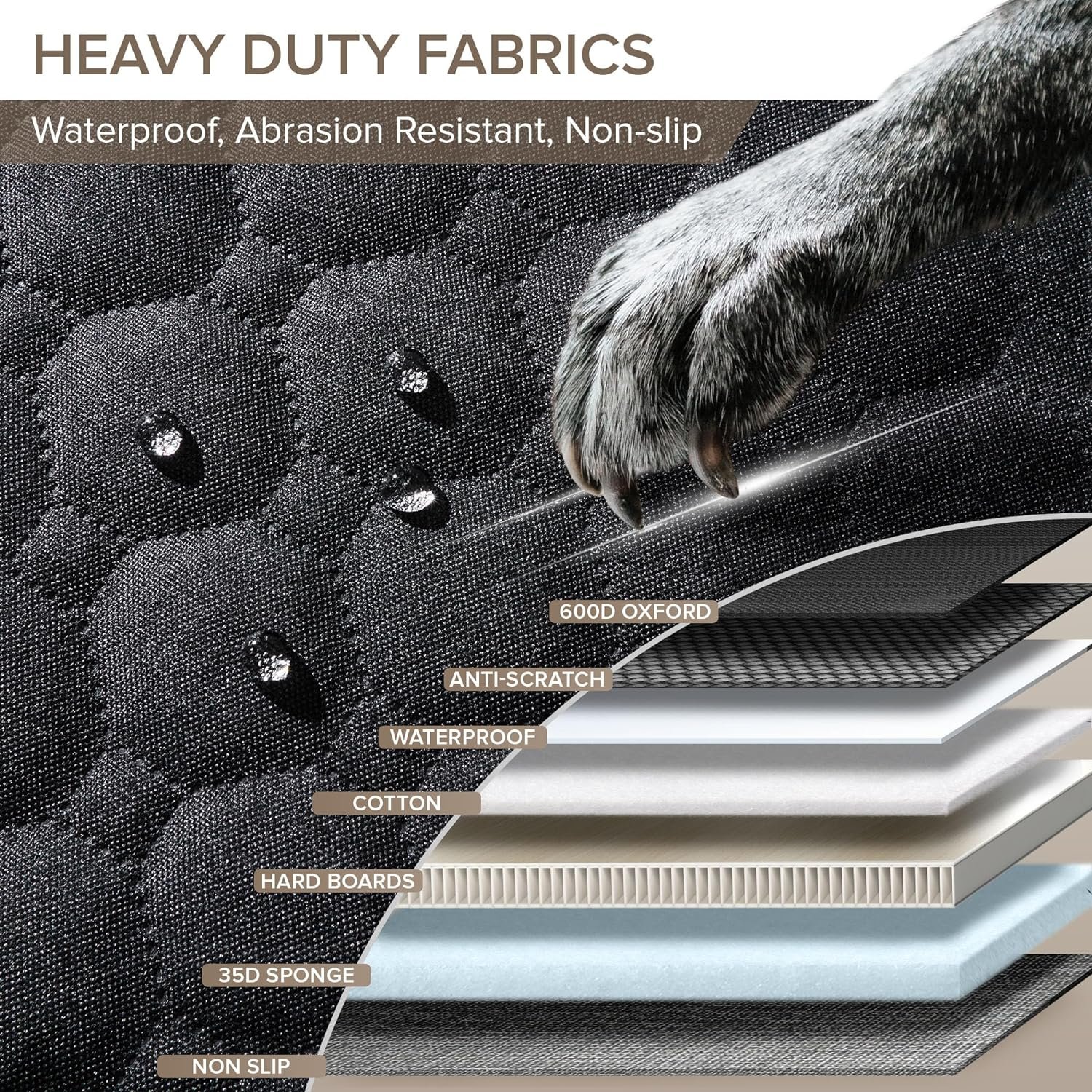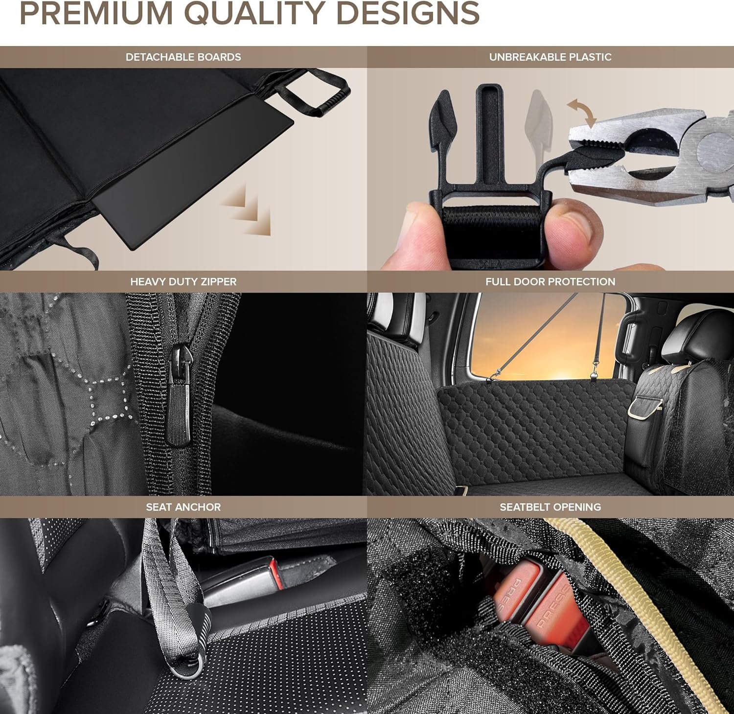 7-LAYER MATERIALS FOR STRONG SUPPORT, PROTECT AND COMFORT – Constructed with heavy duty materials including 600D scratch-resistant Oxford, waterproof fabric, thickened hard bottom boards, 35D soft sponge and cotton layers for added comfort and non-slip fabric that wouldn’t slide. Pet seat cover for back seat safeguards trucks from wear, water, and stains, extra-high door protector prevents scratches, allowing dogs to hop in and out joyfully, leaving you with perfectly preserved interio