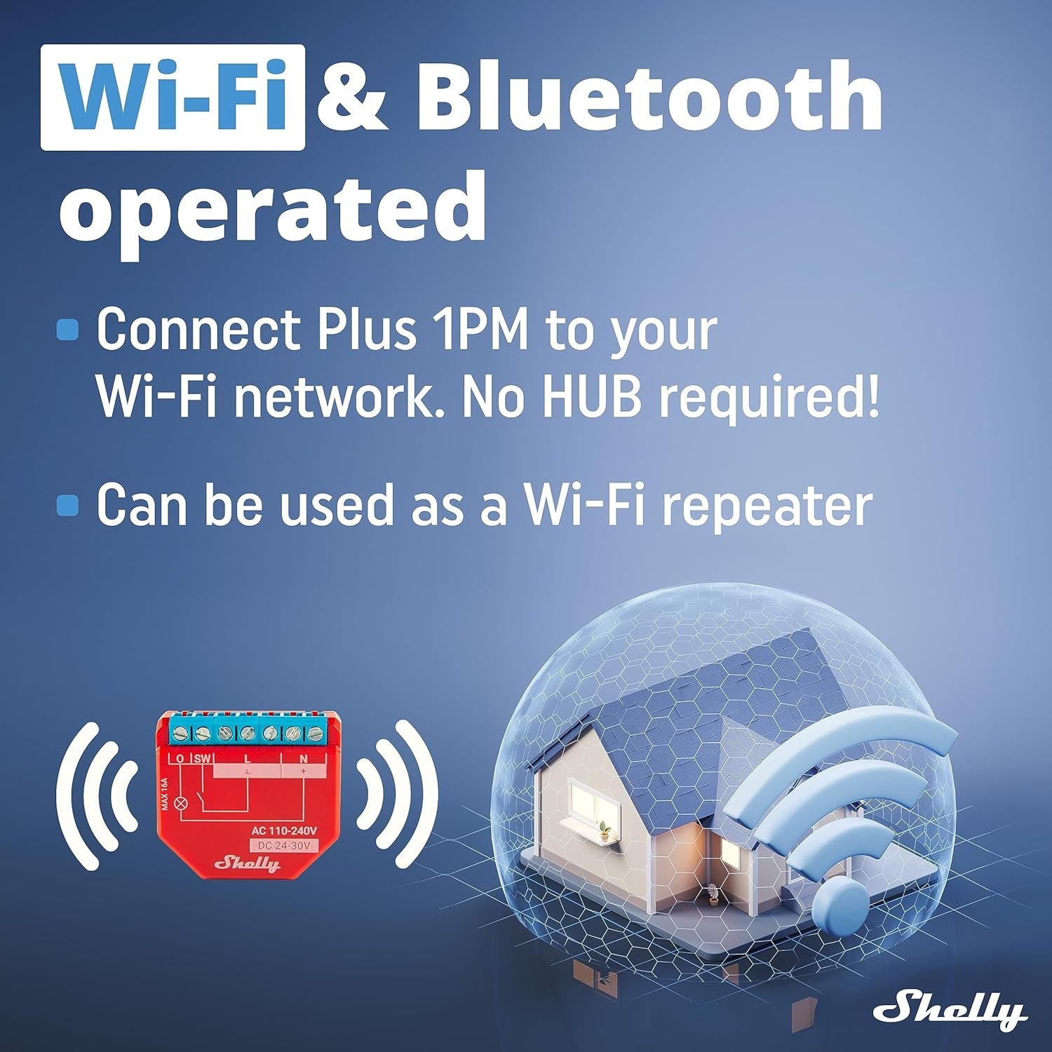 Shelly Plus 1PM is a Wi-Fi & Bluetooth operated smart switch relay UL certified with 1 channel, up to 15A with power metering that can be used also as a WiFi repeater. Shelly Plus 1PM UL can be used to monitor consumption and take control of any home appliances, electric circuits, and office equipment individually.