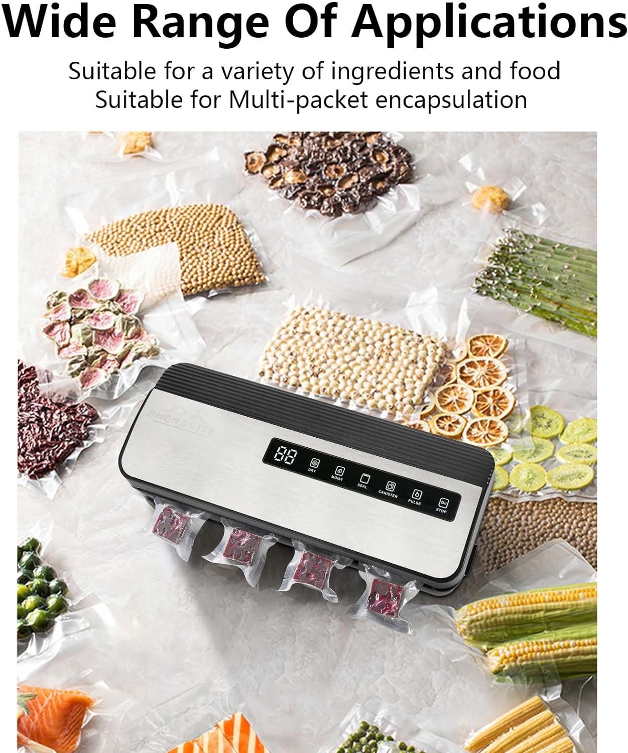 The Shengsite external vacuum sealers is a green machine in kitchen appliances,compact but comprehensive ,powerful enough and simple to operate,suitable for various meat, seafood, fruits, vegetables, nuts, bread and etc.