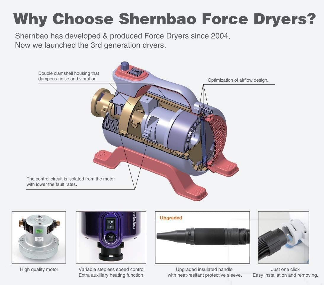 【AMAZING FORCE】Compare to hand dryers our dryer improve efficiency over 60%, saving your precious time, especially when grooming large dogs.