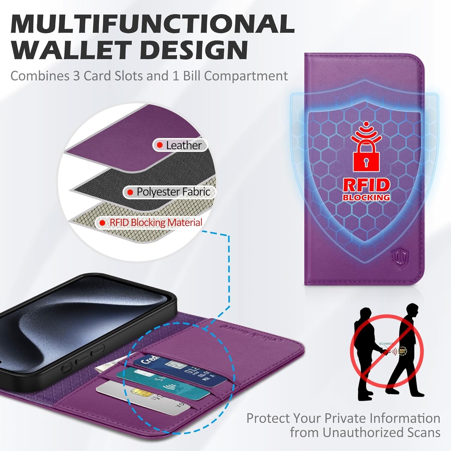 【RFID BLOCKING TECHNOLOGY】 This iPhone 15 Pro Max wallet case combines the functions of a wallet and phone case. 1. It features 3 card slots and a full-length pocket to help you store driving license, cards and several cash. 2. Card slots are designed with RFID shielding technology that can block RFID signals and protect the personal information from unauthorized scanners