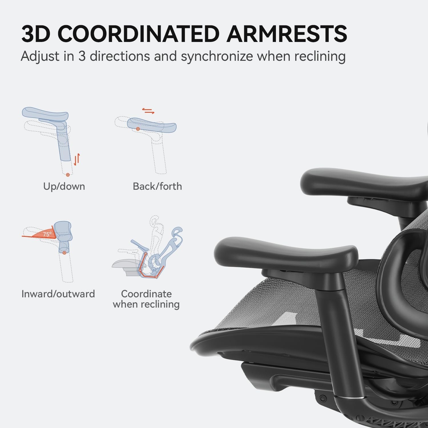 【Self-Adaptive Lumbar Support & 3D Coordinated Armrests】When seated in the SIHOO Doro C300 computer chair, the self-adaptive lumbar support automatically moves with your body, and the ergonomic office chair provides continuous support and comfort to your lower back, effectively alleviating back pain and protecting your health. The desk chair’s 3D armrests adjust in three directions and synchronize when you recline, allowing you to relax your arms in all positions.