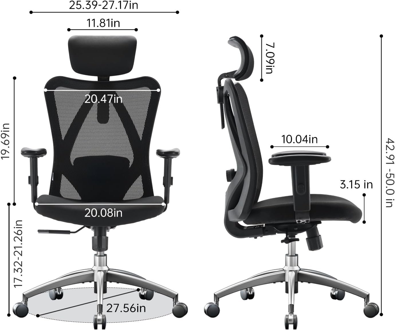 【ERGONOMICE OFFICE CHAIR】- The ergonomic chair provides 4 support points (head/back/hip/hands) and proper lumbar support. SIHOO designs ergonomic chairs to meet different needs, with seat height, headrest adjustment, lumbar support and back support adjustment, suitable for long sitting and reduce your pain. Suitable for people 5’6″ to 6’2″ tall.