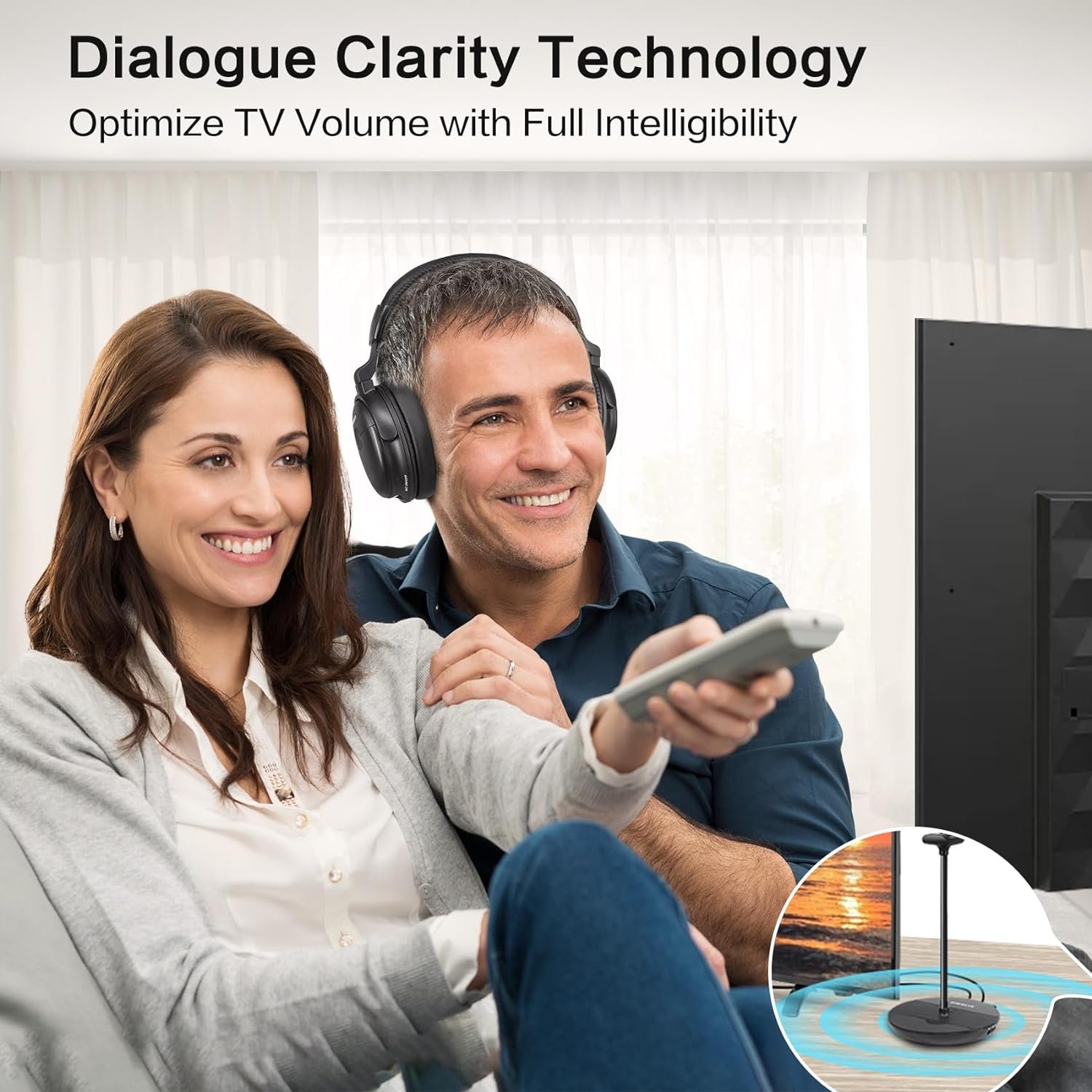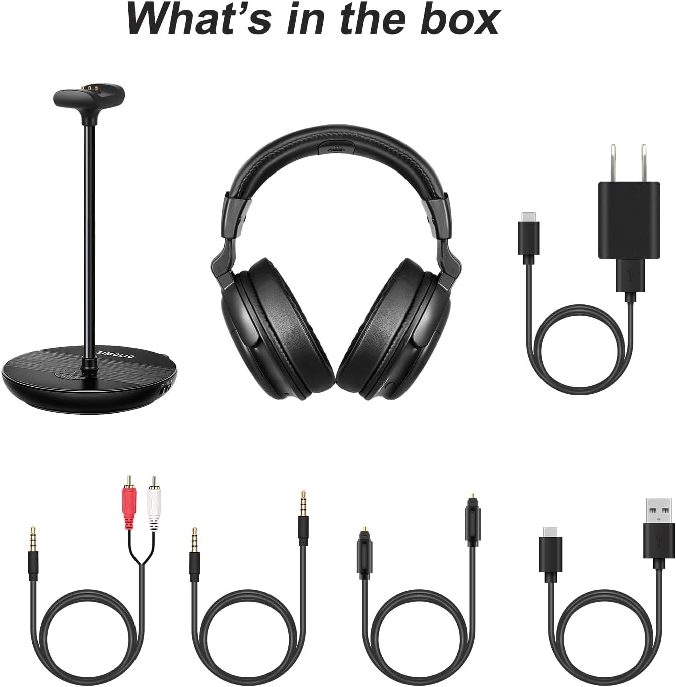 [Optimize TV Volume with Full Intelligibility]Unlike other headphones that only emphasize high volume, this wireless TV headphone features voice clarity tech that reduces distracting background noisesto make TV conversations stand out, allowing you to hear every second of your favorite shows, films and songs without turning up your TV volume.Auto signal control tech stabilizes sudden increases in TV volume to protect your hearing. Supports optical, RCA & 3.5 mm audio outputs on all TVs.