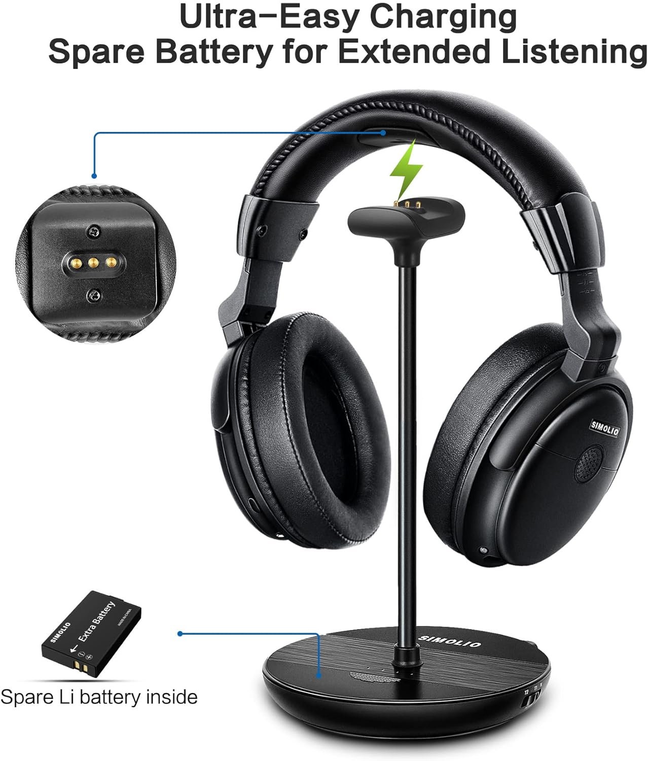 [Max Comfort & Convenient Charging] Over-Ear TV headphones with protein earmuffs and retractable soft-padded headband providing lasting comfort. Full-sealed noise isolating ear pads effectively reduce the outside noise.Wireless headphones for TV watching with transmitter/charging stand 2-in-1. The built-in rechargeable& replaceable battery provides up to 12 hours of work. Besides, a spare battery is always charged in the base and ready for uninterrupted TV enjoyment.