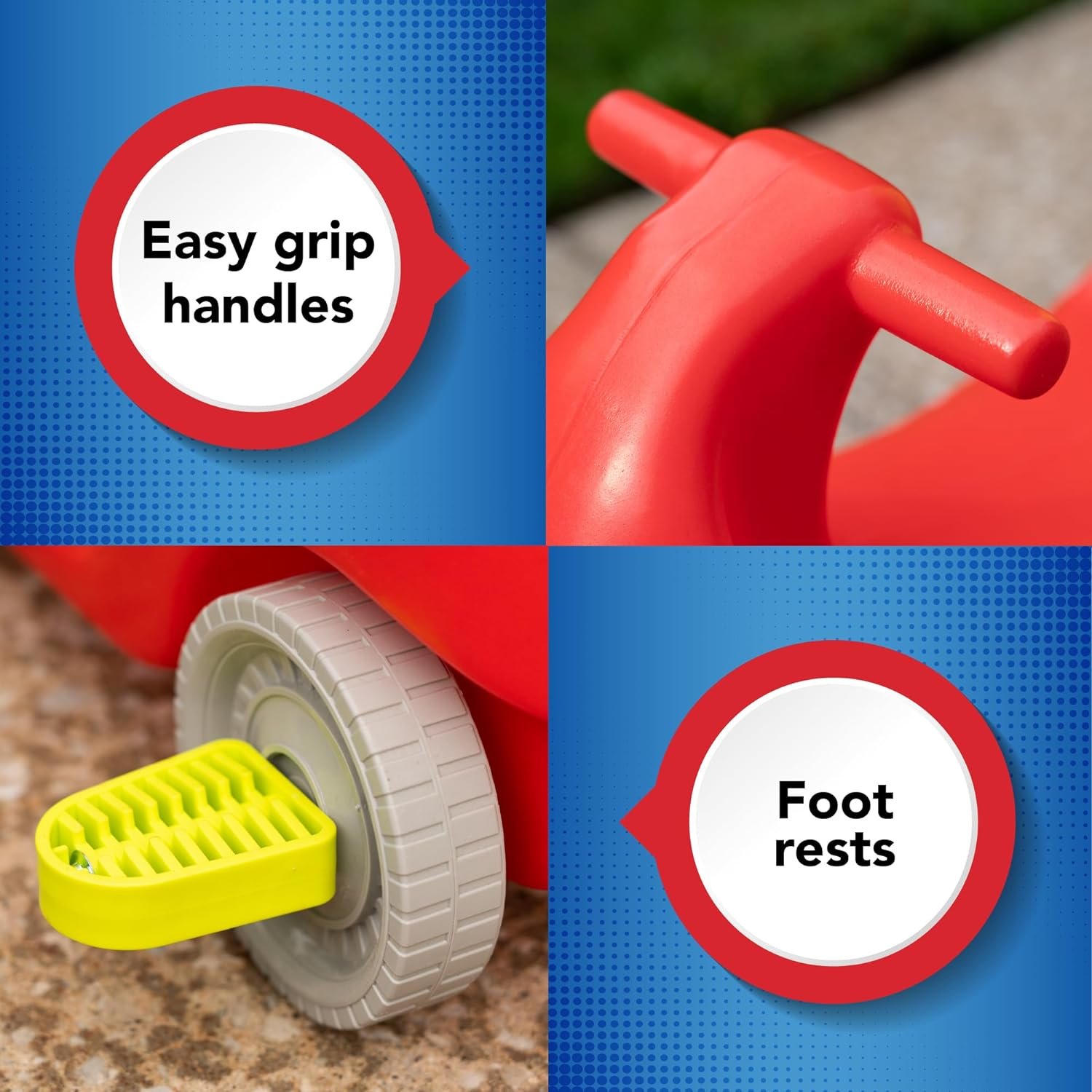 COMFORTABLE RIDE: Kids ride in comfort with sure grip handles, a high seatback and easy reach foot rests. Easy grip, comfort push handle for parents, too