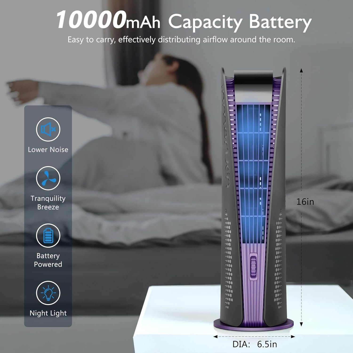 【Standing Fan】Since the battery tower fans don’t require a constant power connection, they contribute to a cleaner and less cluttered environment. There are no cords to trip over or hide, allowing for a neater appearance and easier maintenance.