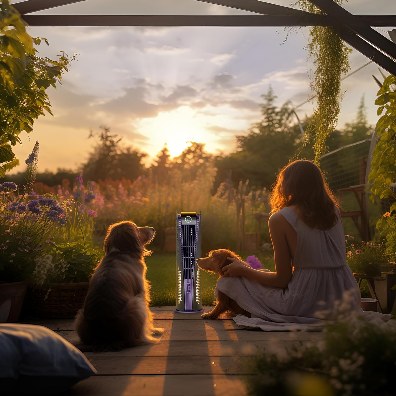 Enjoy playful moments with your pets outdoors. Our tower fan adds comfort to your joyful memories together.