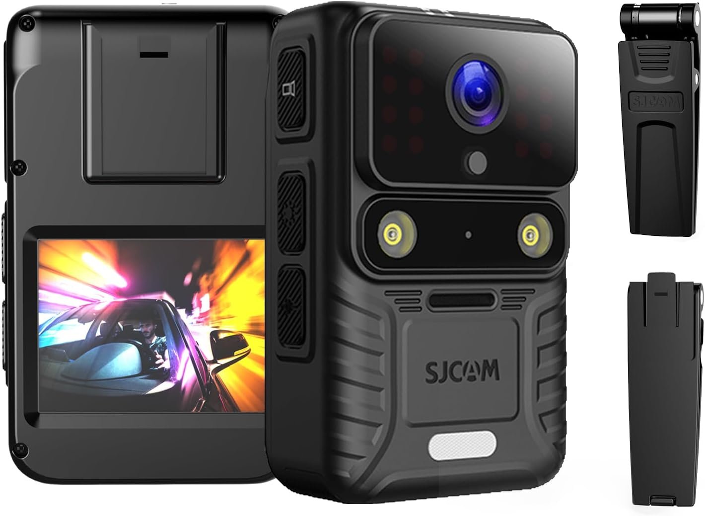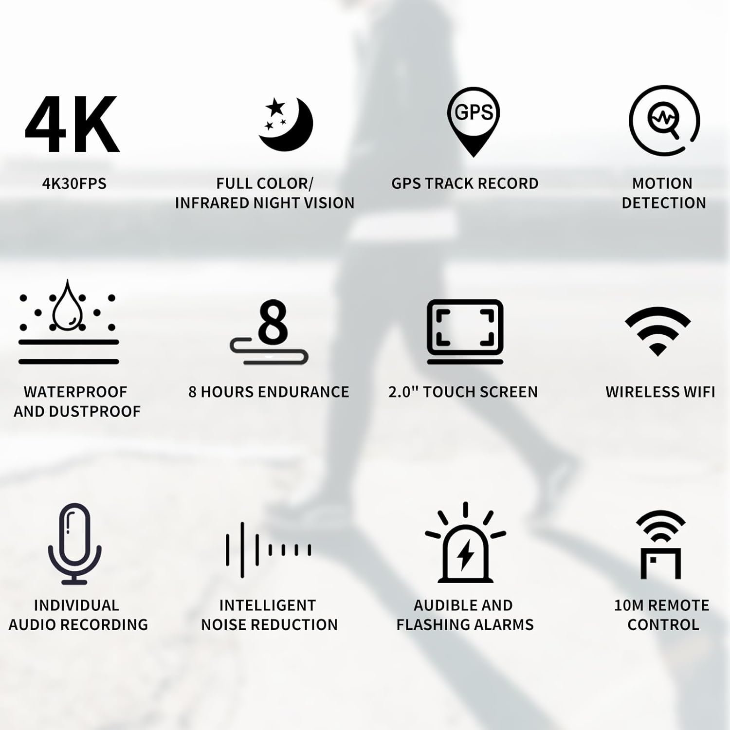 【4K Wearable Camera】Support 4K 30FPS ultra high definition video recording and clearer 20MP photo. With 12pcs infrared lights, 2pcs bright LED fill lights, 135°wide angle lens and 2.0 inch touch screen, the body camera can capture more details whether during the day, rainy day or at night.