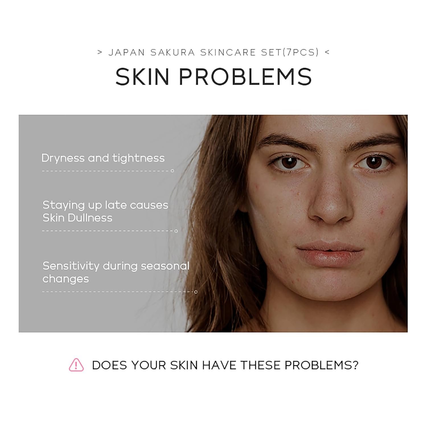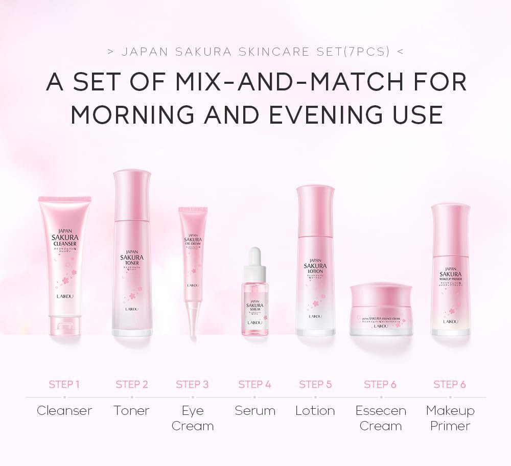 Cleans & Nourishes Skin: Toiletries travel kit is infused with cherry blossom extract. First, use cherry blossom cleanser to clean the face; and then use toner, lotion, serum, face cream to moisturize dry skin; thirdly, use eye cream to smooth fine lines around the eyes so that you can glow healthier; finally, use make up primer to create a natural makeup looking