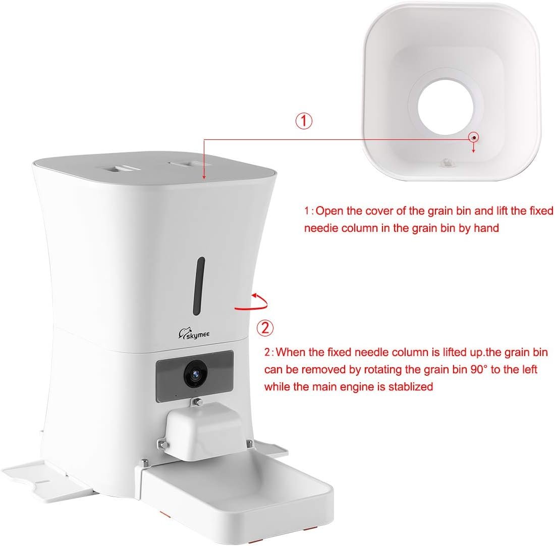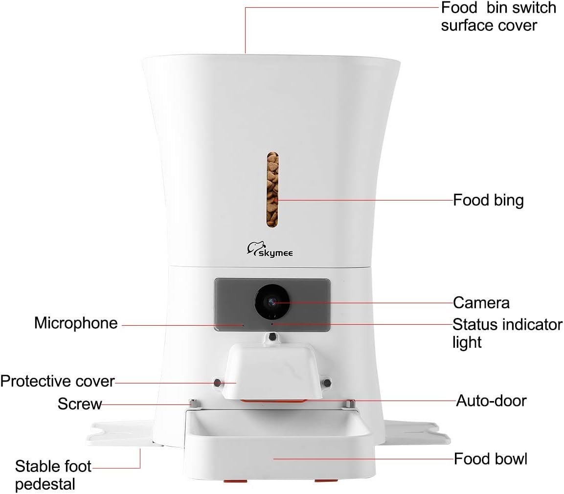 MORE — Skymee will alert you when it detects dog movements or food running low. Dual power supply system with external USB cable and 3 pieces D batteries (not included) to prevent power off. Please pay attention that skymee pet feeder can only connect 2.4G WiFi, not supports 5G WiFi