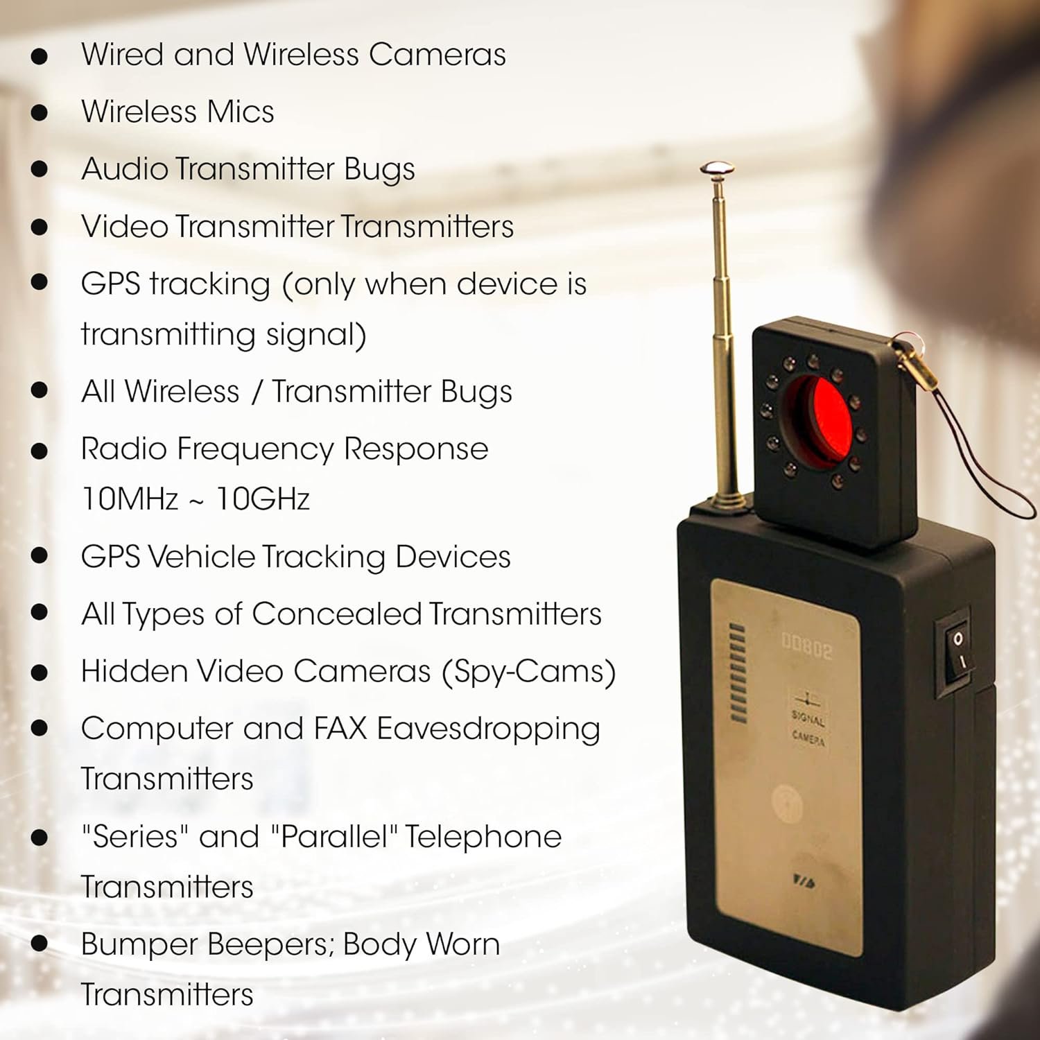 PERFECT FOR EVERYDAY USE: We live in a world where technology makes it easy for crooks to invade your personal space. The Maxi-Tech bug and video camera detector will give you a leg up by allowing you to sweep vulnerable areas, including dressing rooms, bathrooms and hotel rooms. This electronic device finder will give you peace of mind when you’re on the go!