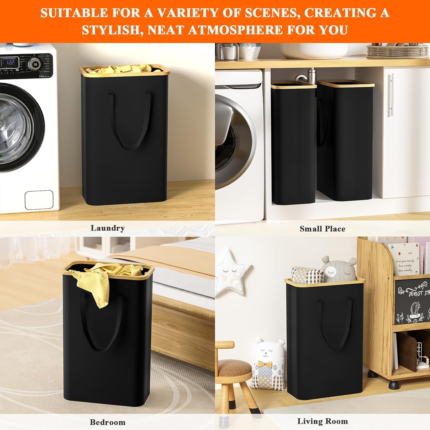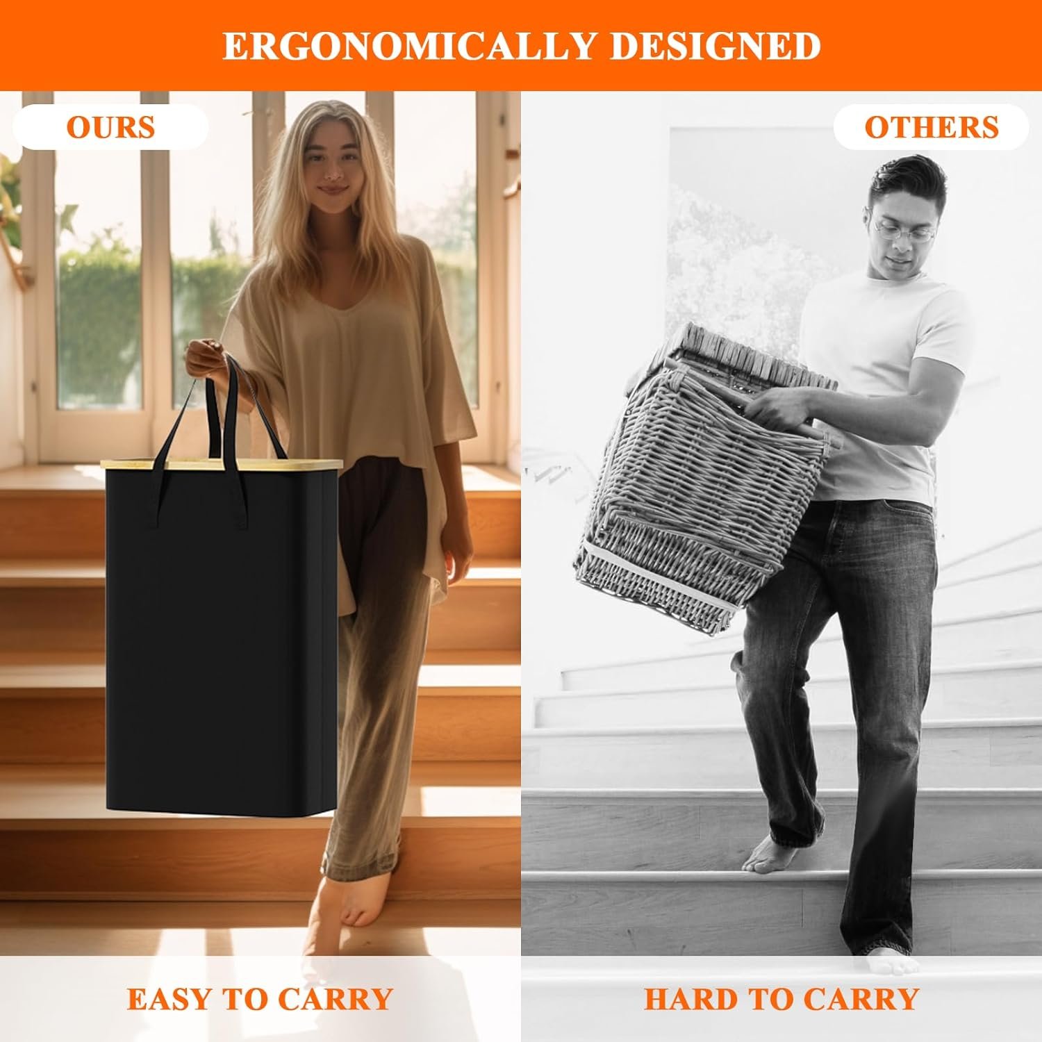 【Freestanding Laundry Basket】 The high-quality bamboo frame, carbon fiber support bar, and 600D polyester oxford fabric not only make our laundry hamper stand firmly but also make it a simple and elegant look that fits into any scene.