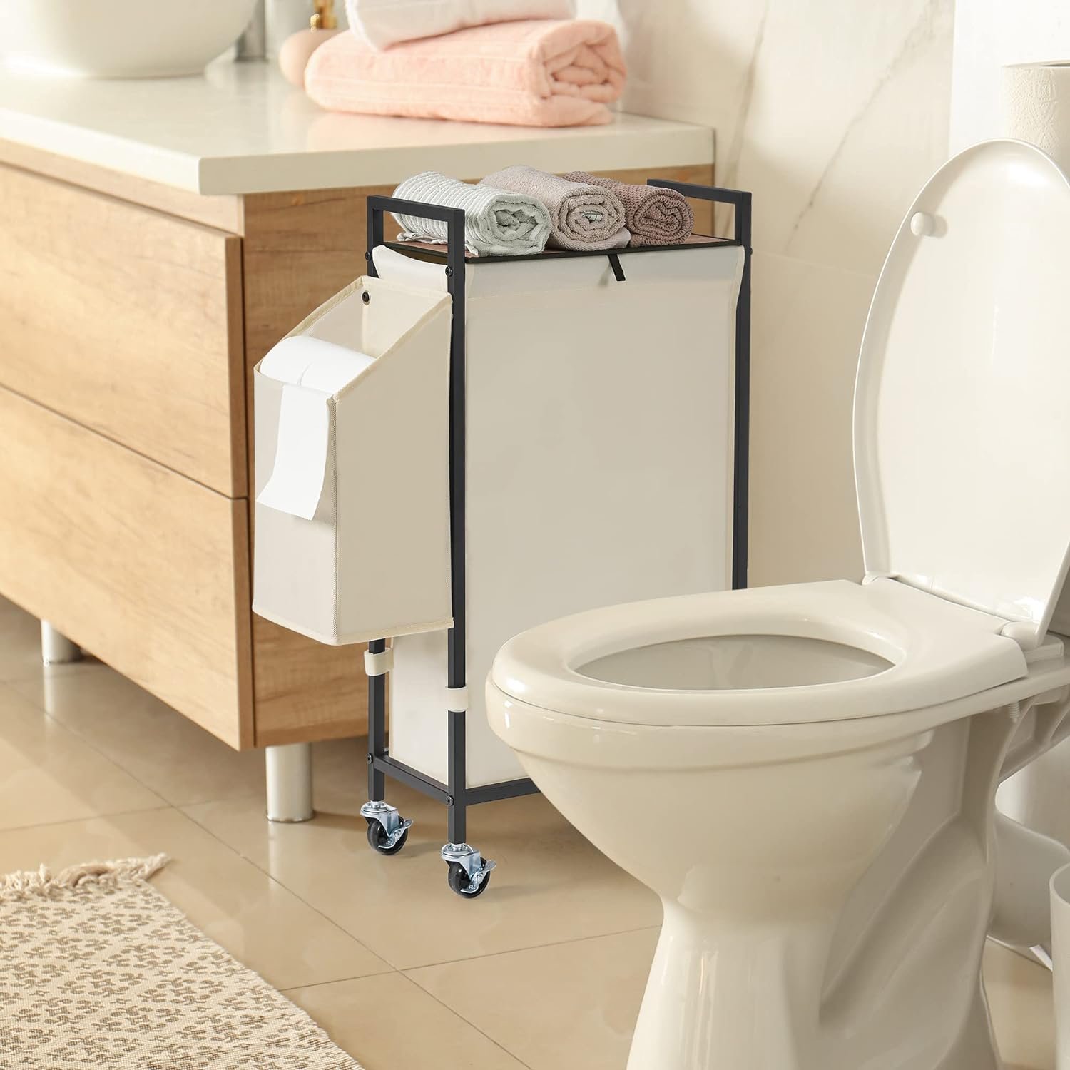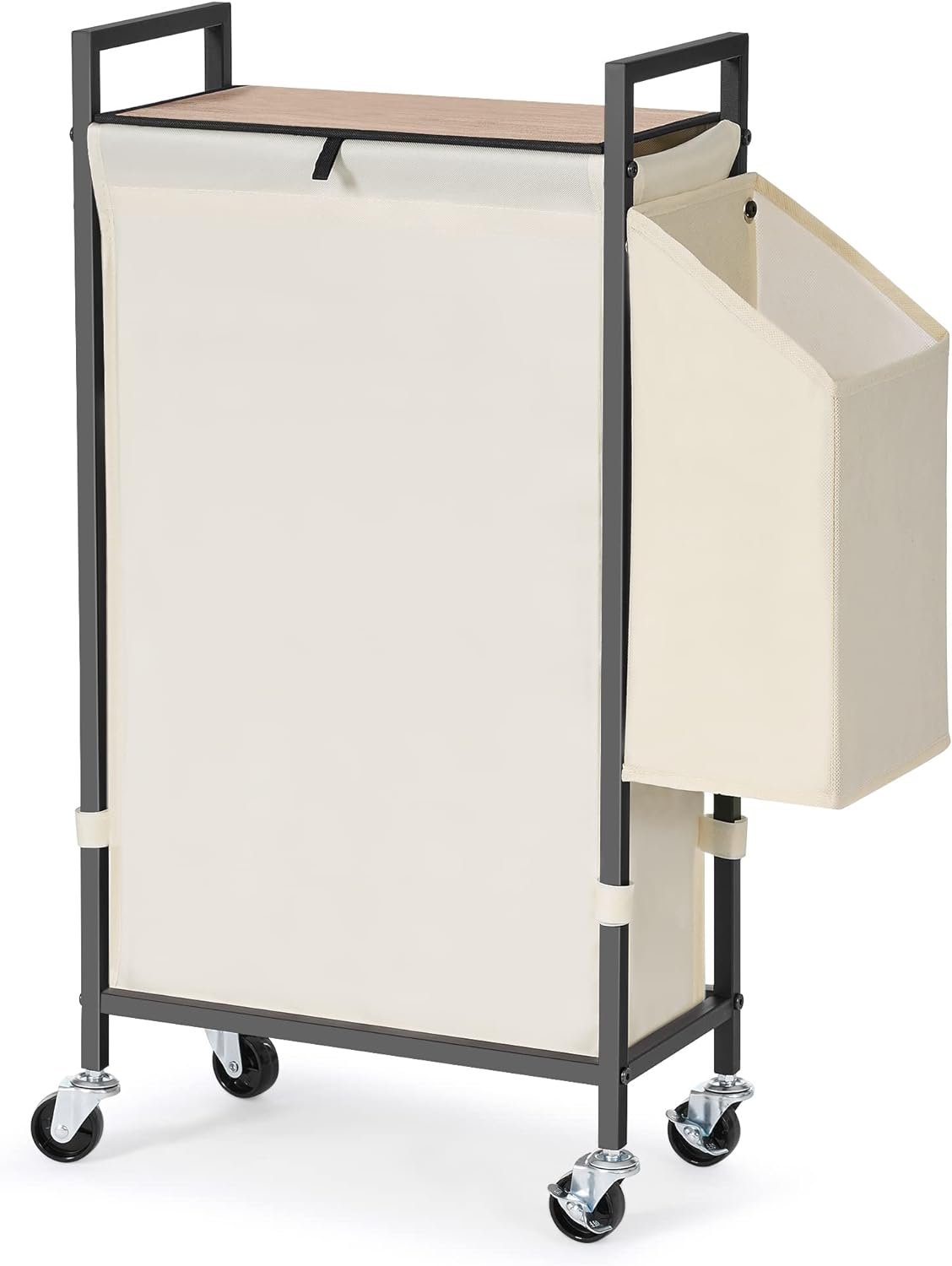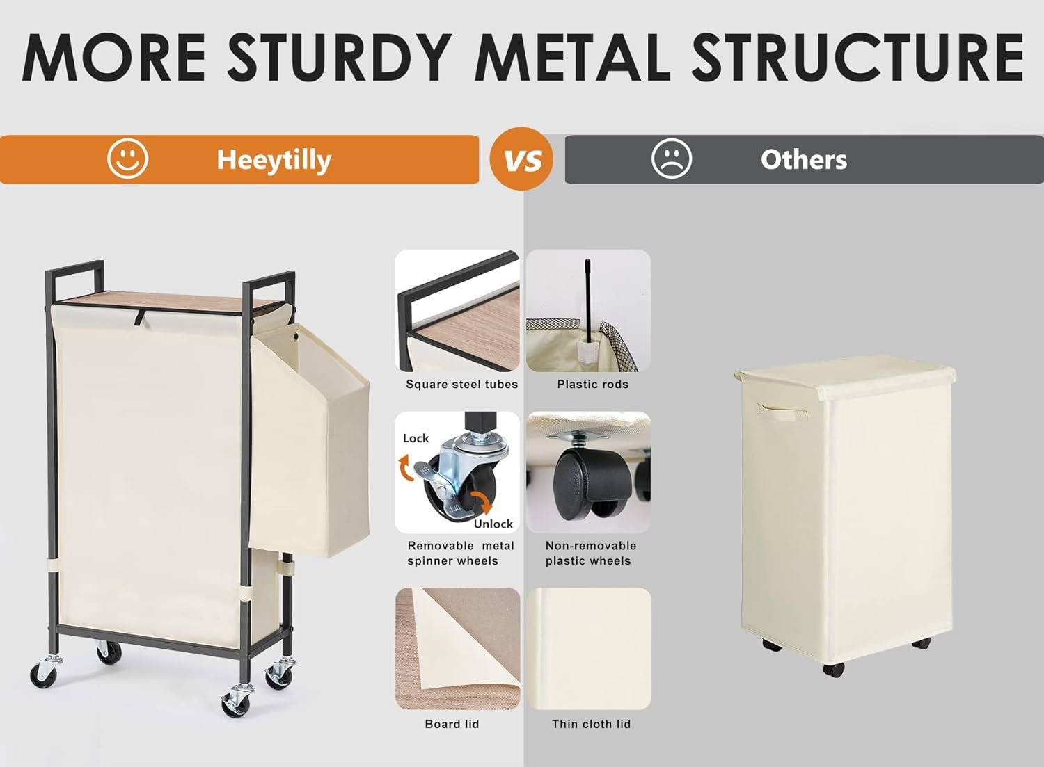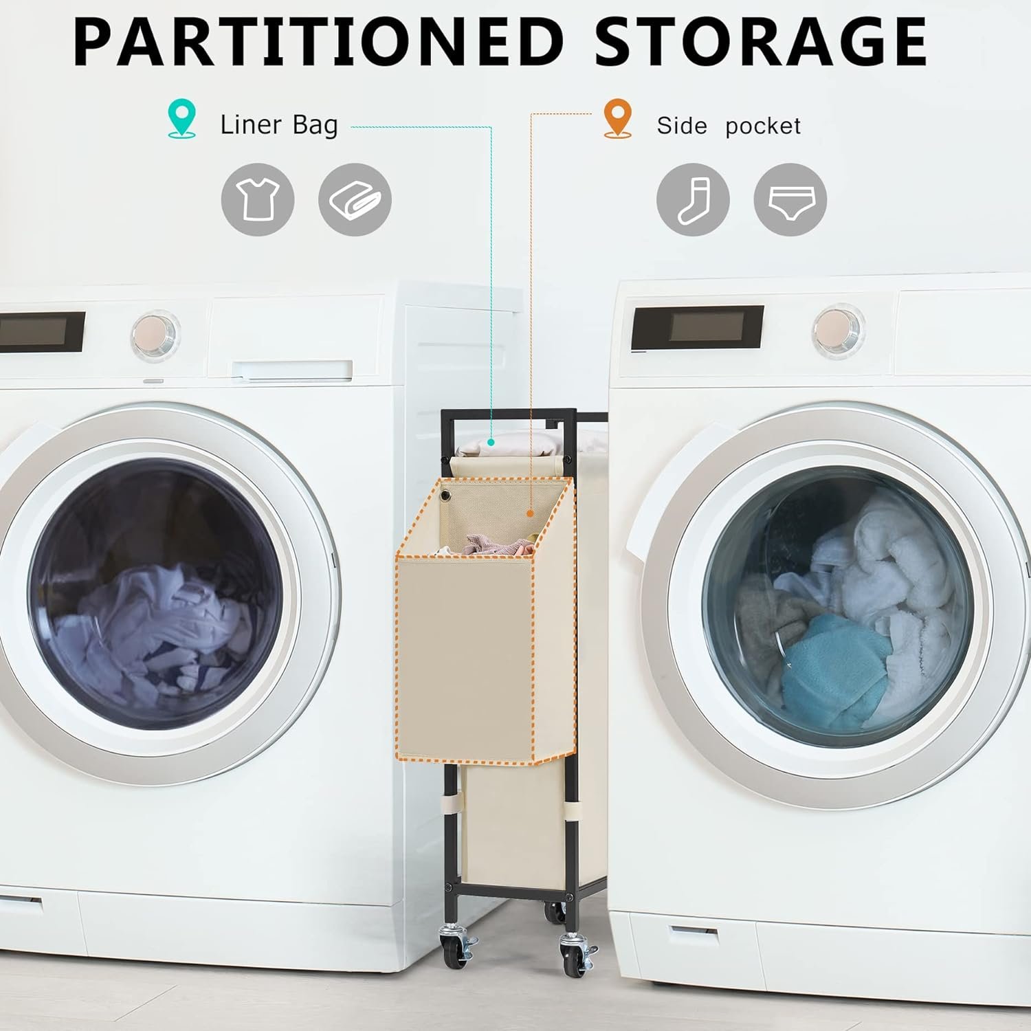 ♥【Exceptionally Strong Load-Bearing Capacity】 Our laundry hamper is built to last with a sturdy frame made of square steel tubes and thick metal wires on the sides. The 600D thickened Oxford liner bag provides exceptional load-bearing capacity of up to 55 lbs. Even when empty, the rolling slim laundry hamper stands upright.