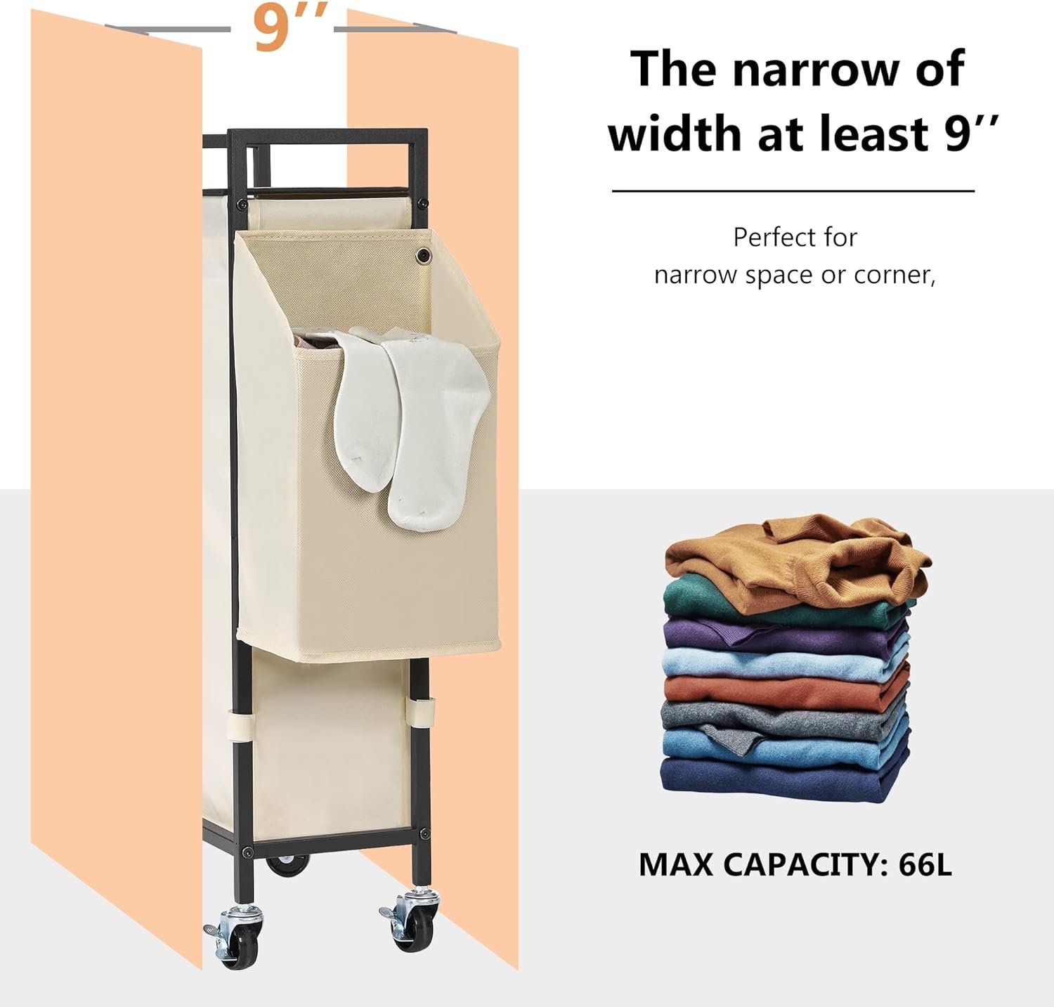 ♥【Compact and Versatile Laundry Cart】 Measuring 17.72″L x 9.25″W x 31.5″H, it fits perfectly in any corner of your home. Designed for small spaces, it keeps your dirty laundry out of sight, helping you stay organized. Suitable for large families or personal use, this slim cart is an excellent choice.