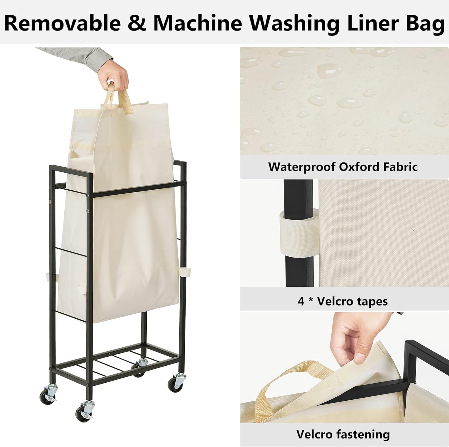 ♥【Easy-to-Clean Liner Bag】 Our slim clothes hamper also features a removable and easy-to-clean waterproof liner bag. Made from 600D oxford coating material, the liner bag is fixed to the frame with Velcro and has two fabric handles for easy carrying. The hamper also includes a side pocket for storing small items like underwear, socks, or laundry detergents.