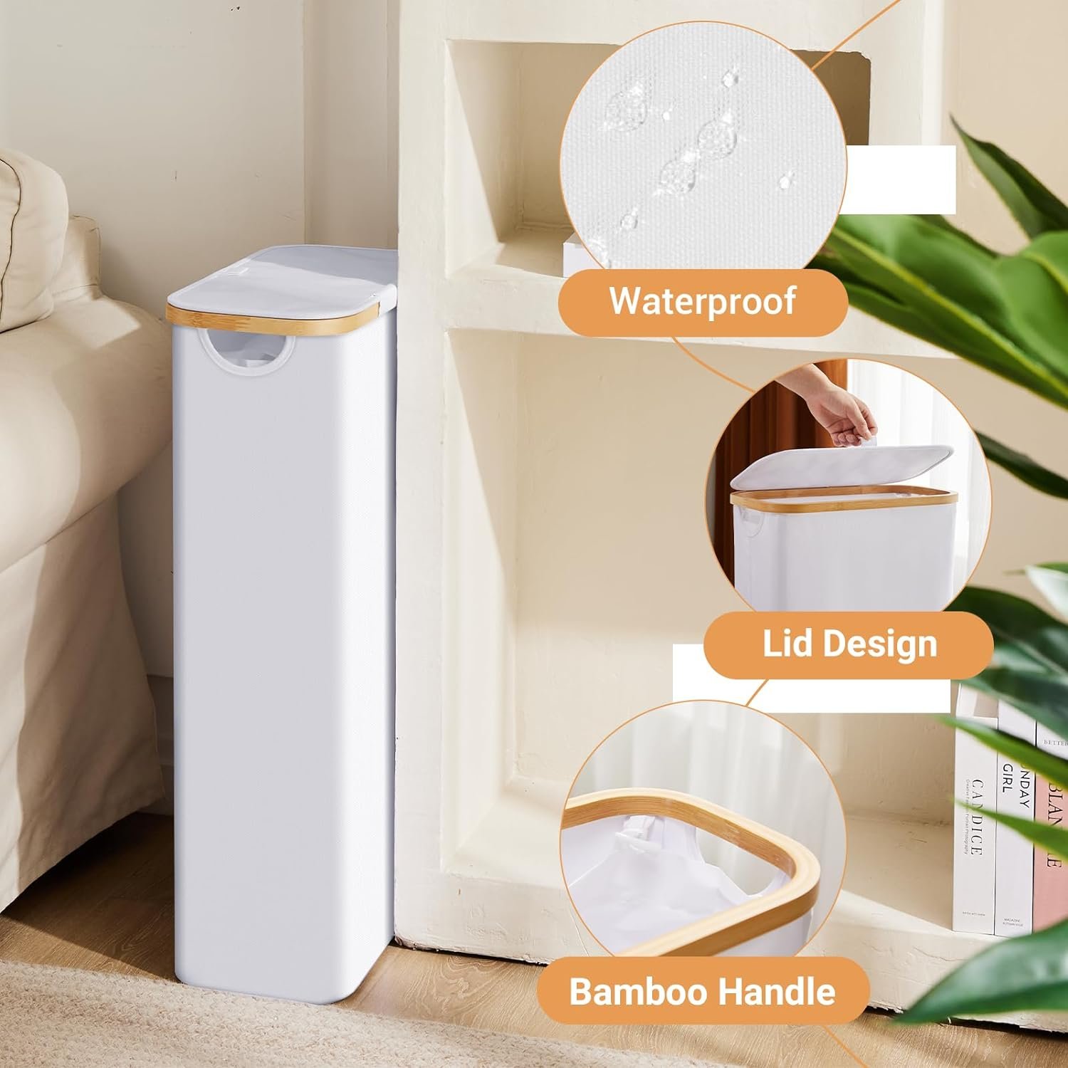 【Laundry Basket with Lid & Bamboo Handles】 This laundry hamper features a bamboo handle, and a smooth surface that protects hands, and provides maximum comfort during gripping. The cleverly designed lid prevents odors from spreading, keeping your surroundings fresh and maintaining a clean, aesthetic appeal. our narrow laundry basket is made from high-quality materials, sturdy and sturdy.