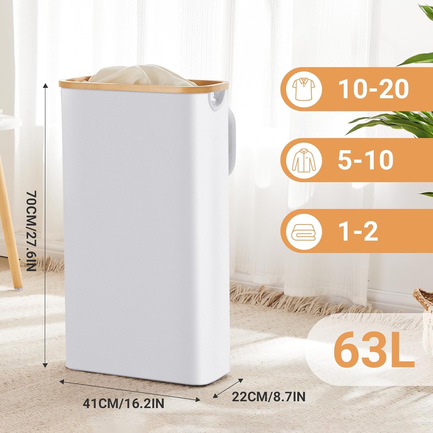 【Skinny Laundry Hamper】 Fiona’s magic slim laundry hamper measures 16.1”L x 8.7”W x 27.6”H. With the ability to hold up to 63L of clothing, this narrow laundry basket ensures maximum storage while occupying a small space. Perfectly suited for placement in any tight of your home, it effortlessly blends into your interiors.