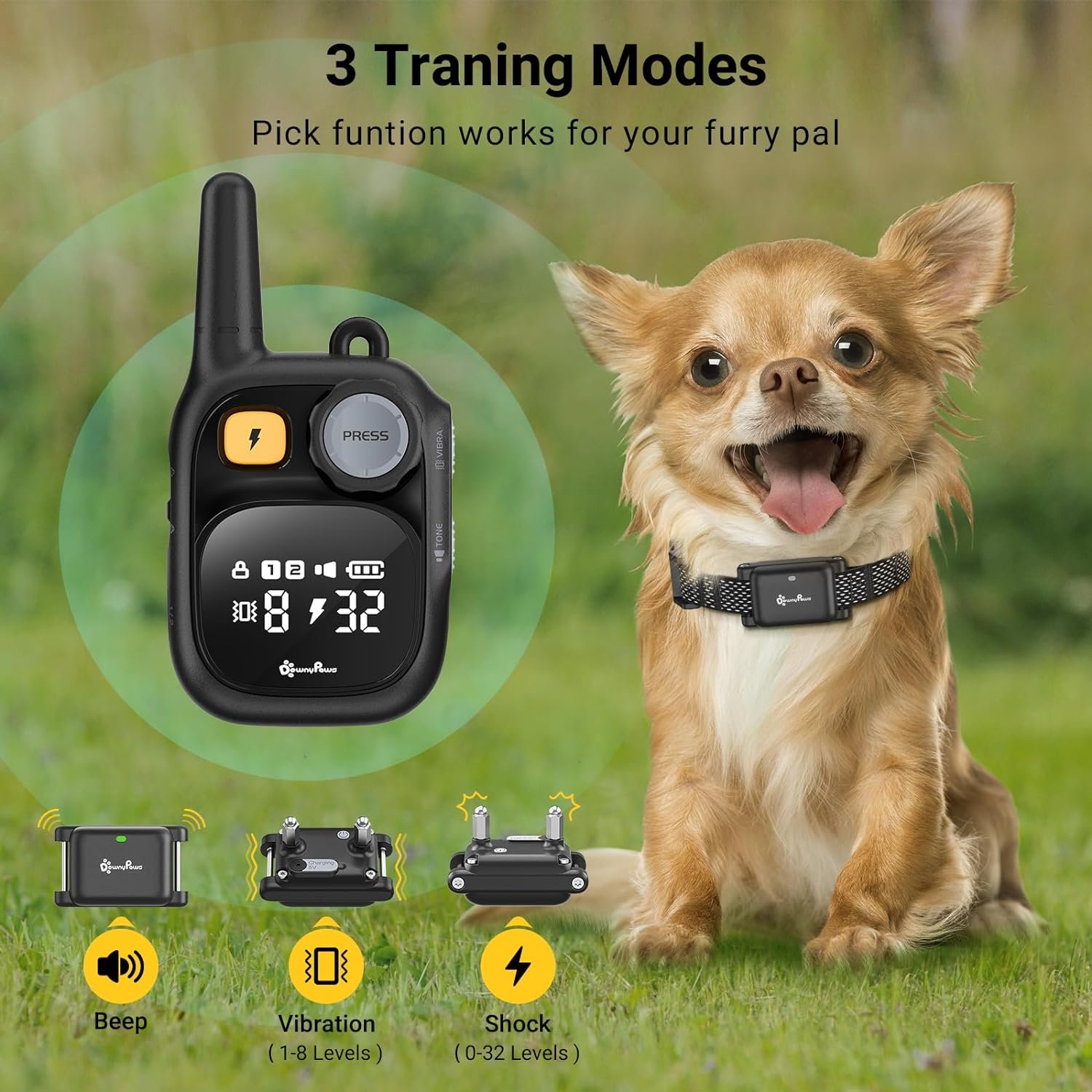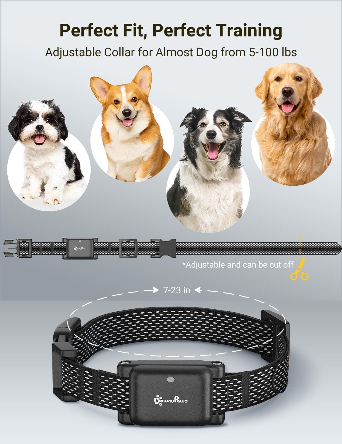 DownyPaws shock collar for small dogs 20-30 lbs are tailored for small size dogs such as Chihuahuas, Poodles and Bichon Frise. Come with lightweight and smaller size, this dog shock trainer collar will make your puppy feel comfortable. The woven strap of this training collar with remote fits for dogs 5-100lbs, it can be cut as your need, please end the strap with lighter to avoid spreading. Puppy shock collar for training small dogs.