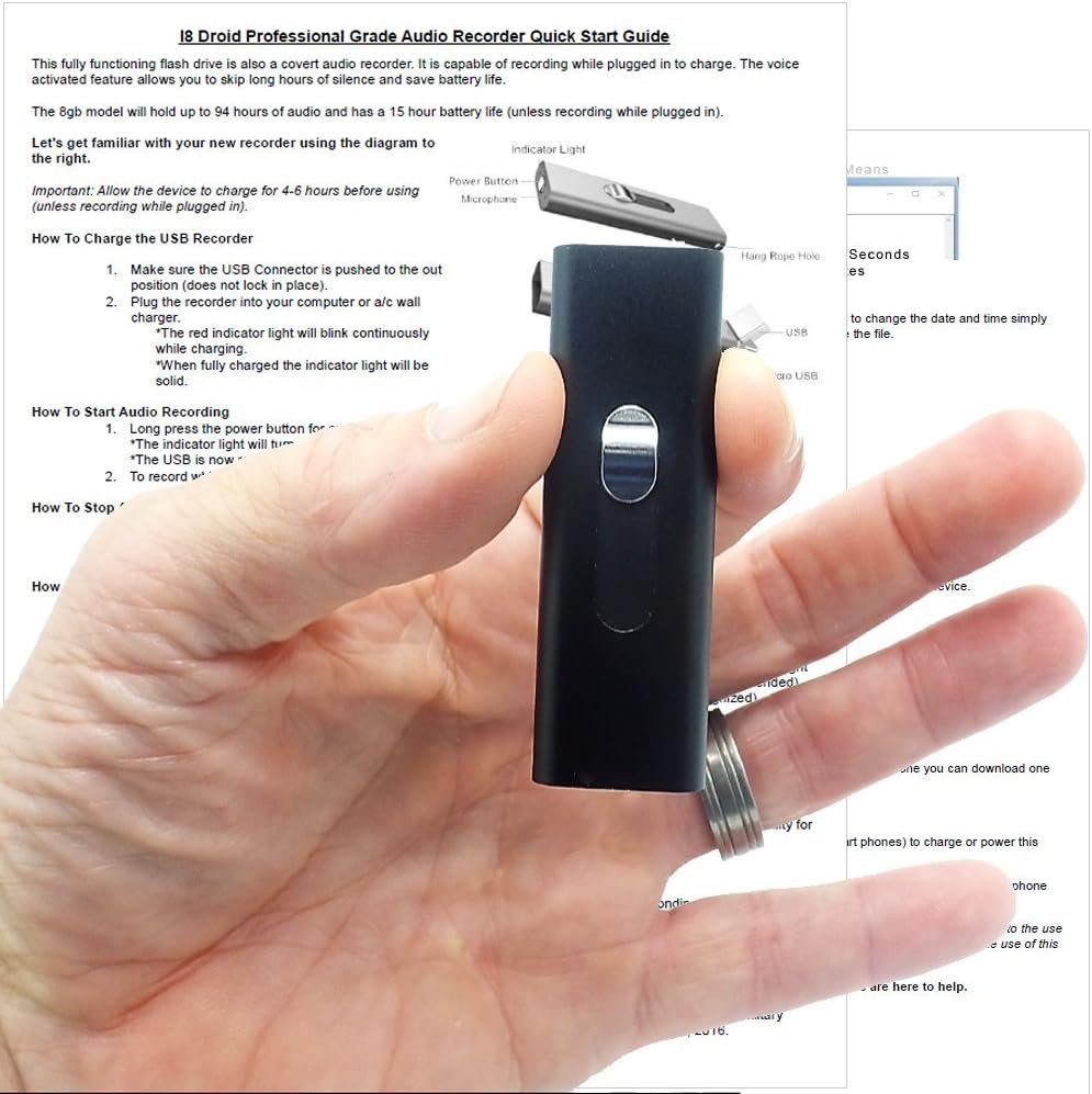 PROFESSIONAL GRADE FEATURES – The I8 Droid voice activated audio recorder boasts one of the highest bit rates on the market today | 94 Hour Recording Capacity | Long Lasting 15 Hour Battery Life | Capable of recording while plugged in for charging provides unlimited covert recording | DATE & TIME STAMP