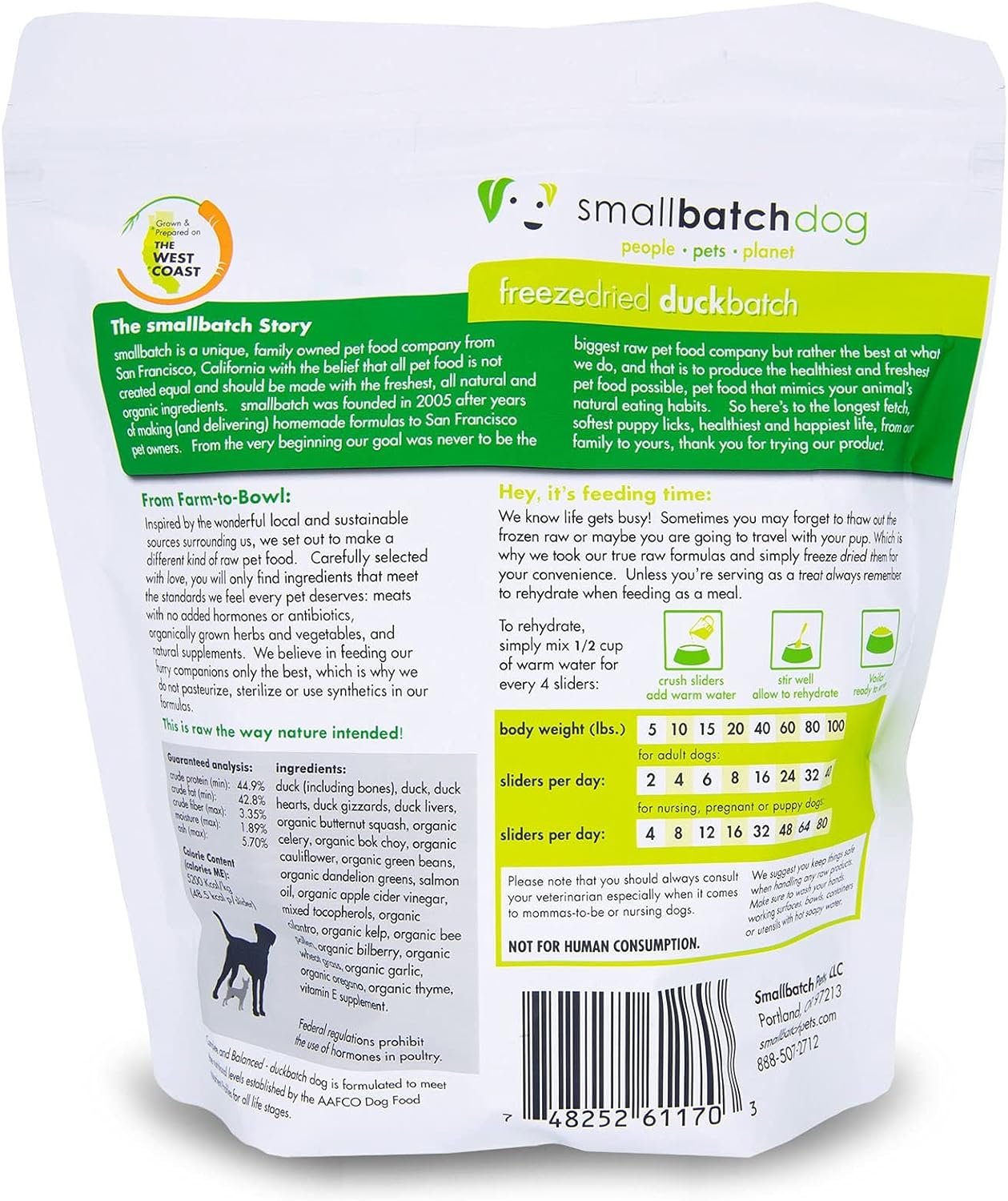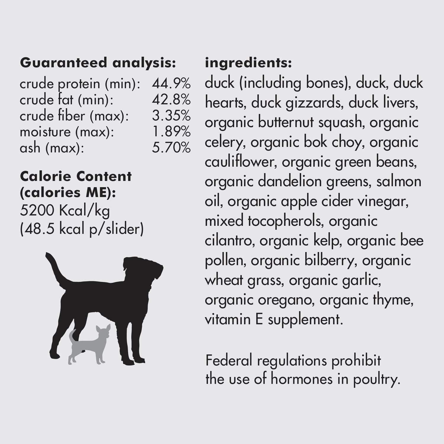 What’s in the Bag? – Each bag of our 14oz freeze-dried duck dog food has about 50 sliders. All meats are responsibly sourced and harvested. Our produce is organic. The foundation of our business is in the sourcing. We only partner with locally procured ranchers and farmers that maintain transparent food policies and that are committed to providing leadership in sustainability and land stewardship. It’s how we’ve served our customers for the 15+ years in business.
