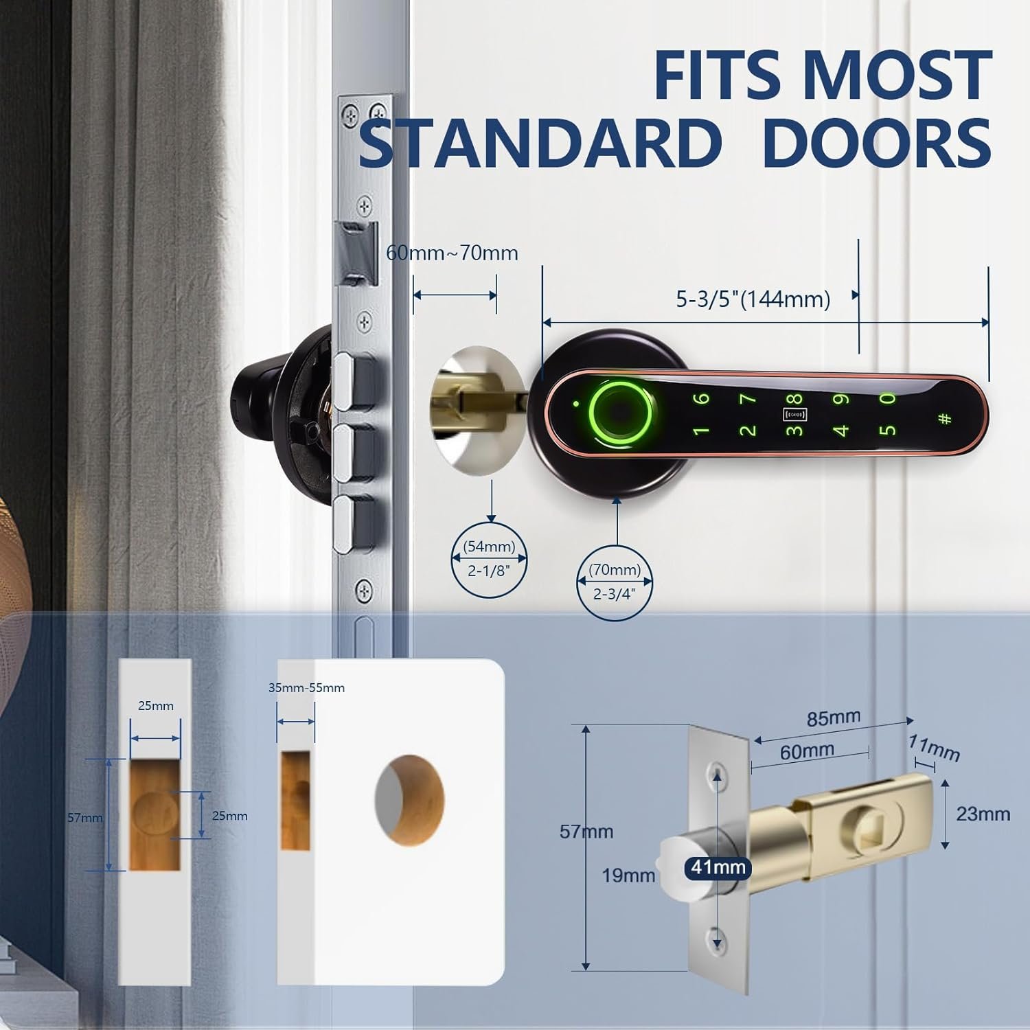 Easy to Installtion: Fits most standard single-cylinder US interior doors and gate. o fit US criterion doors with 2-3/8″ (60mm) and 2-1/8″ (70mm) back panels, door thickness from 1-1/8″ to 2″-1/8″ (30mm-55mm). No wiring, no drilling required.
