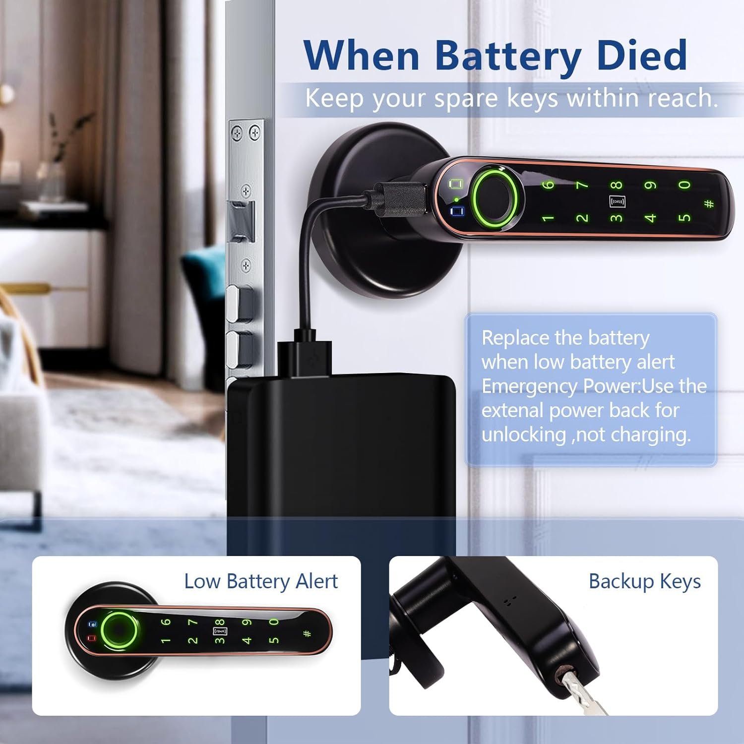 Low Battery Alarm Function: This smart door lock requires 4 AAA batteries (not included) . it has a low battery alarm function and comes with a USB port for emergency charging.