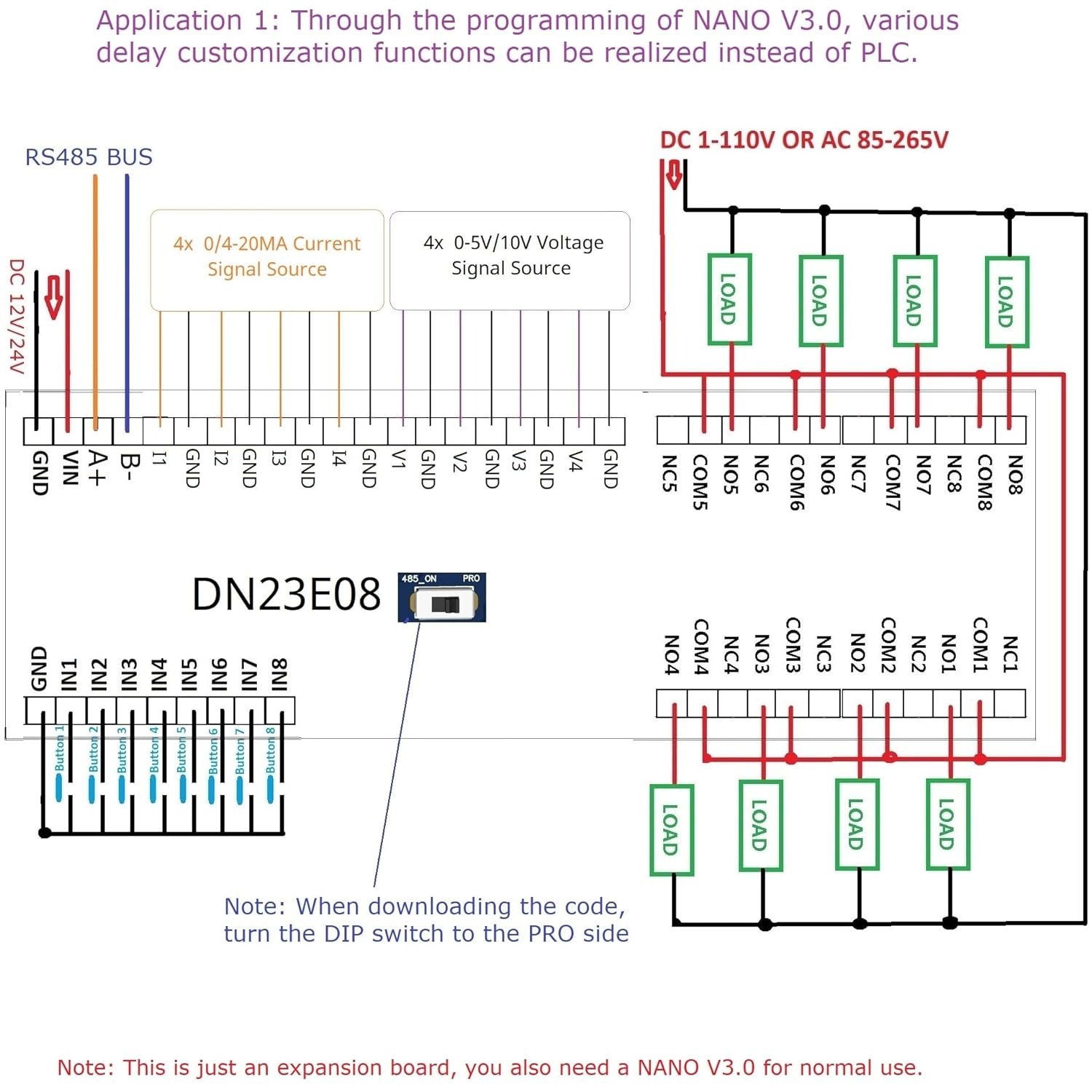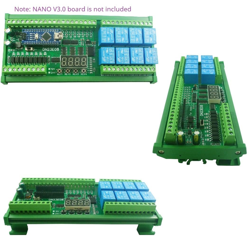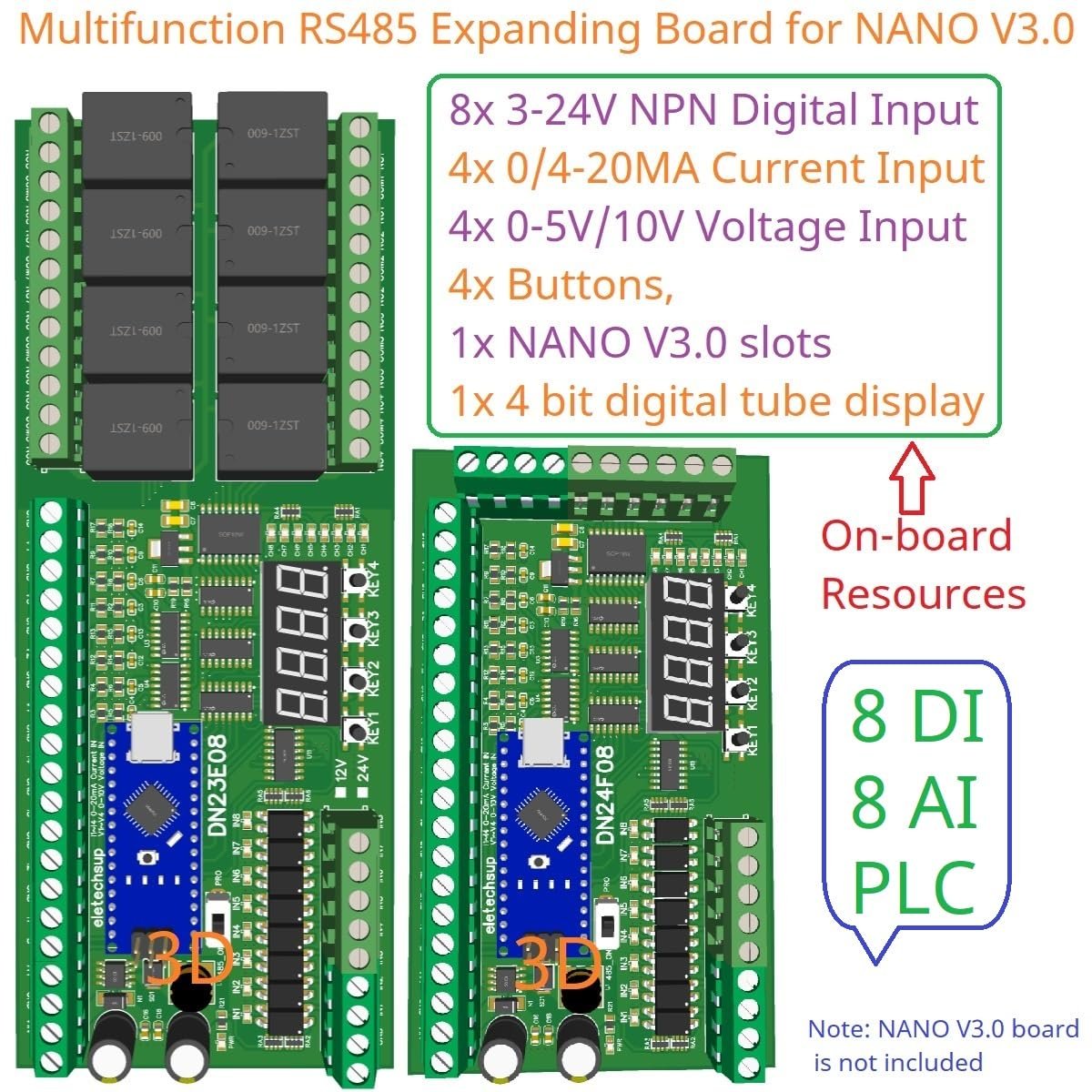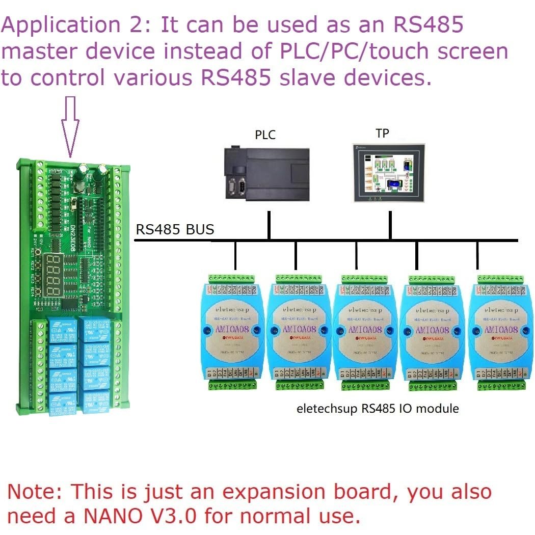 3. on-board resources: 1x RS485 Interface 8x opto-isolated inputs (low level trigger, NPN type), 4x 0/4-20MA Current Input,4x 0-5V/10V Voltage Input,4x buttons, 1x 4 bit digital tube display, 1x NANO V3.0 slots, 8x relay outputs