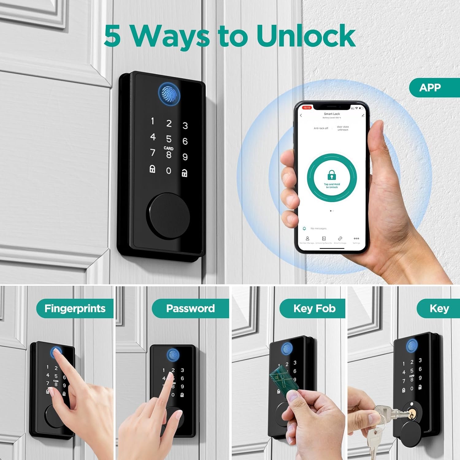 【5 in 1 Smart Door Lock】 The smart lock has 5 Ways to Unlock, such as 360° Fingerprint ID, App Control, Anti-peep Keypad, Fob and Mechanical Key. You can choose any method to unlock your door. Multifunctional locks make your life more convenient.