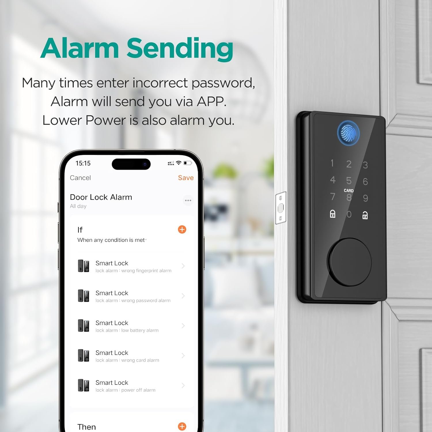 【360°Fingerprint ID & Ultra-long battery life】The fingerprint door lock can recognize your fingerprint in just 0.3 seconds, and unlock your door in 1 second. This electronic door lock consumes little power and lasts up to 1 year* with 4 AAA alkaline batteries. Plus, there’s a low-battery reminder.⚠Type-C Emergency boot option (battery must be removed for charging).