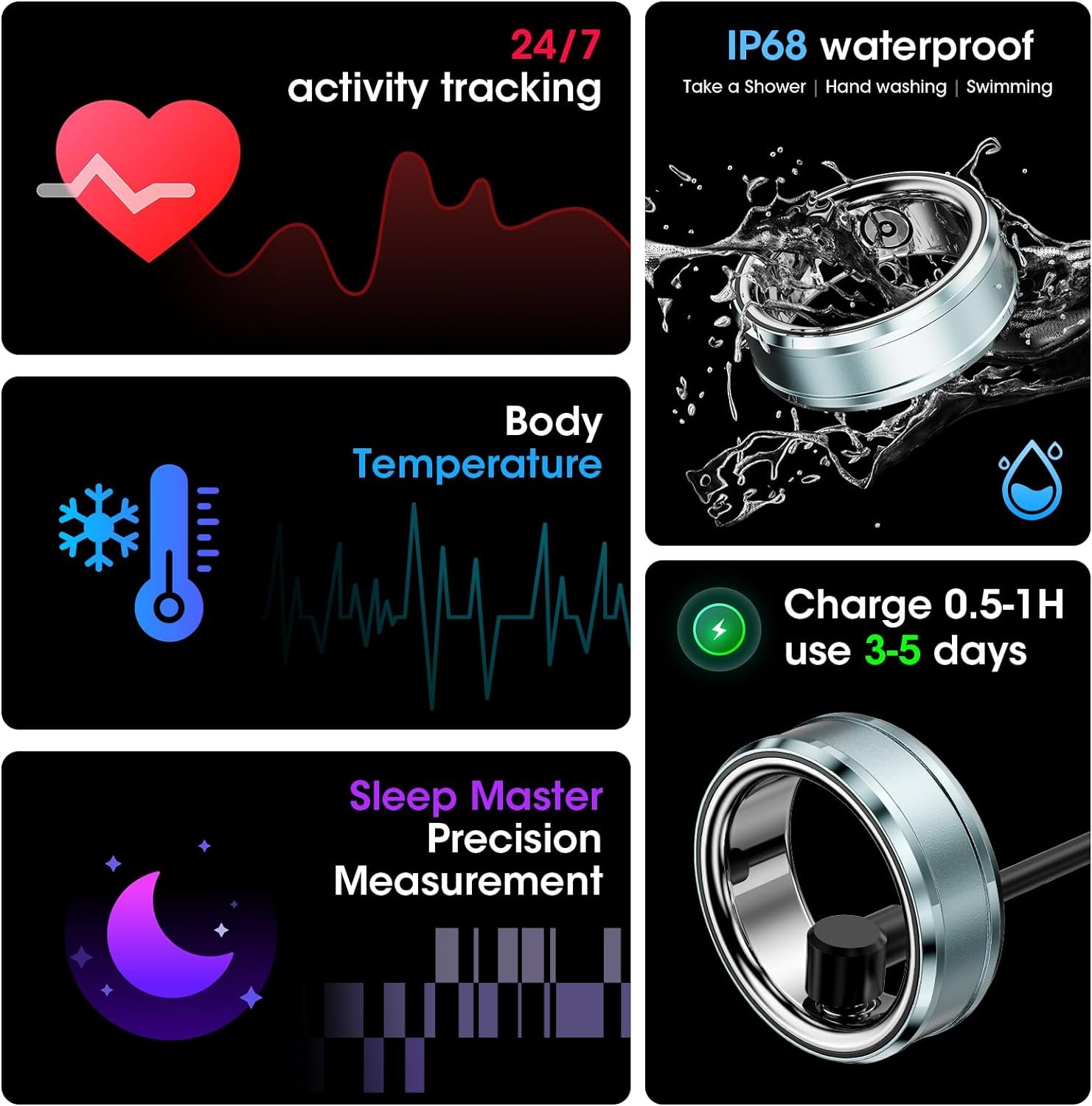 【Good Quality and New Technology】Our smart ring is made of high-quality aluminum-titanium alloy material, fine workmanship, light to wear and skin-friendly, so there is no need to worry about allergic reactions. This smart ring has a long battery life and can be used for 3-5 days after charging for 0.5-1 hour. In addition, it adopts IP68 high waterproof technology, which is waterproof and sweatproof, and does not need to be removed when washing hands. It is your ideal healthy life partner.