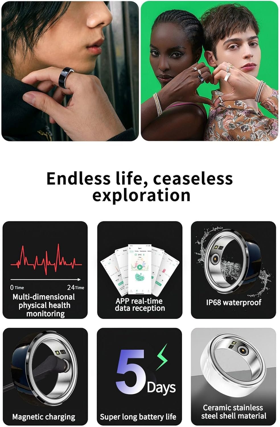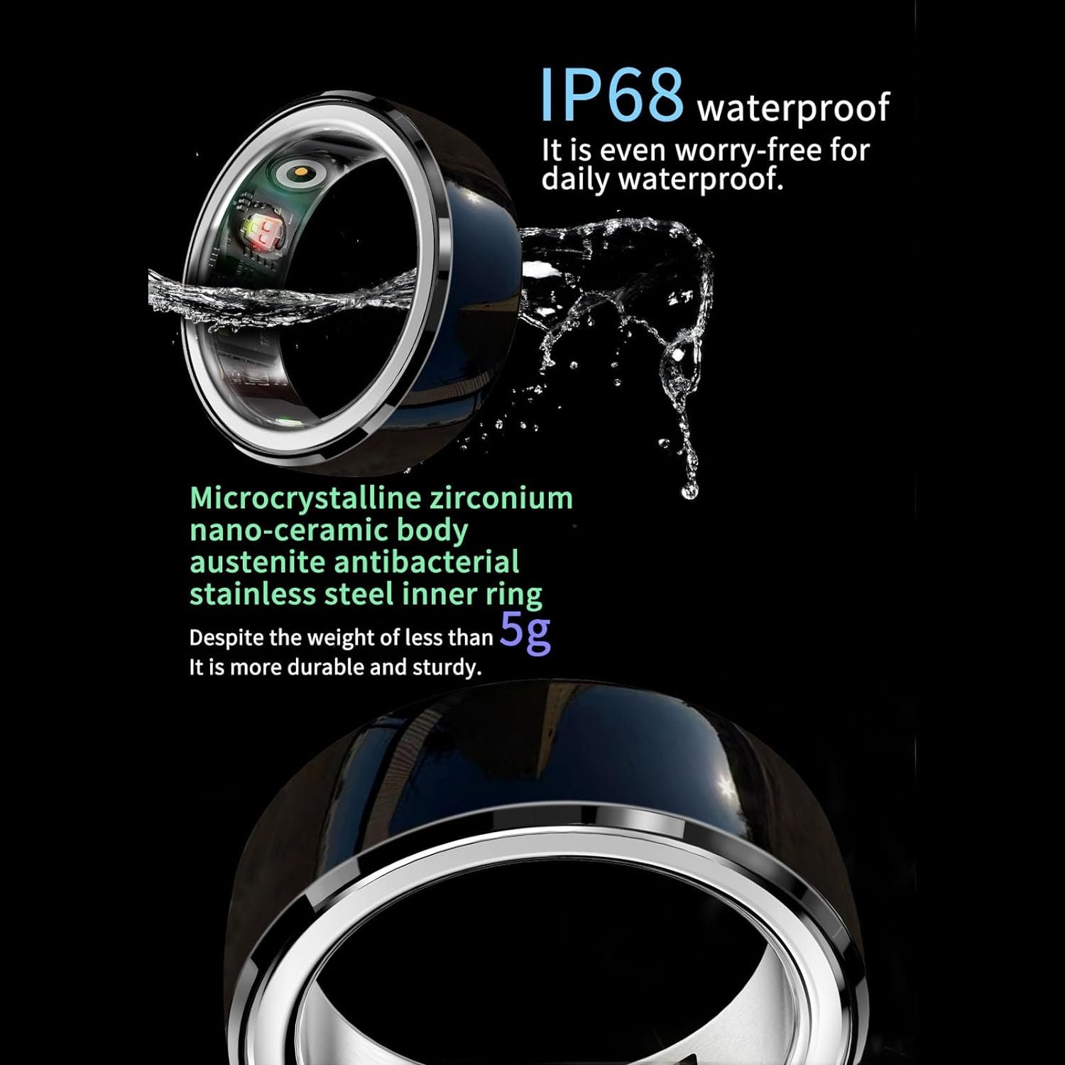 Elegant Design: Crafted from premium aluminum alloy and ceramic, our Smart Ring exemplifies durability and elegance. Its smooth, exquisite surface gives it a luxurious feel, making it a perfect choice for those who appreciate meticulous craftsmanship