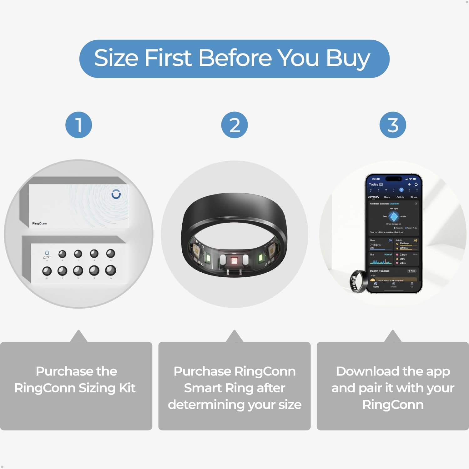 [Size Before You Buy] Before purchasing the RingConn Smart Ring, we highly recommend acquiring the RingConn Sizing Kit to determine the most comfortable and suitable size for your finger.