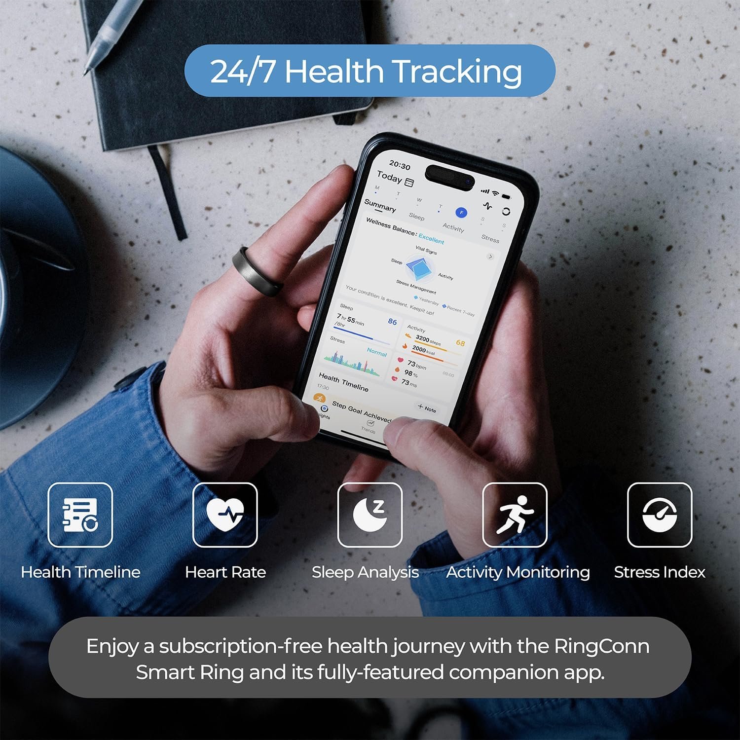[More Than Just Health Monitoring] The RingConn Smart Ring surpasses standard health monitoring features by not only tracking your activity, sleep, stress, heart rate, HRV, and blood oxygen saturation, but also introducing an exclusive Timeline feature. This feature allows you to capture the wonderful moments of life, making it feel like you have a digital diary with you at all times, ready to accompany you through every day.
