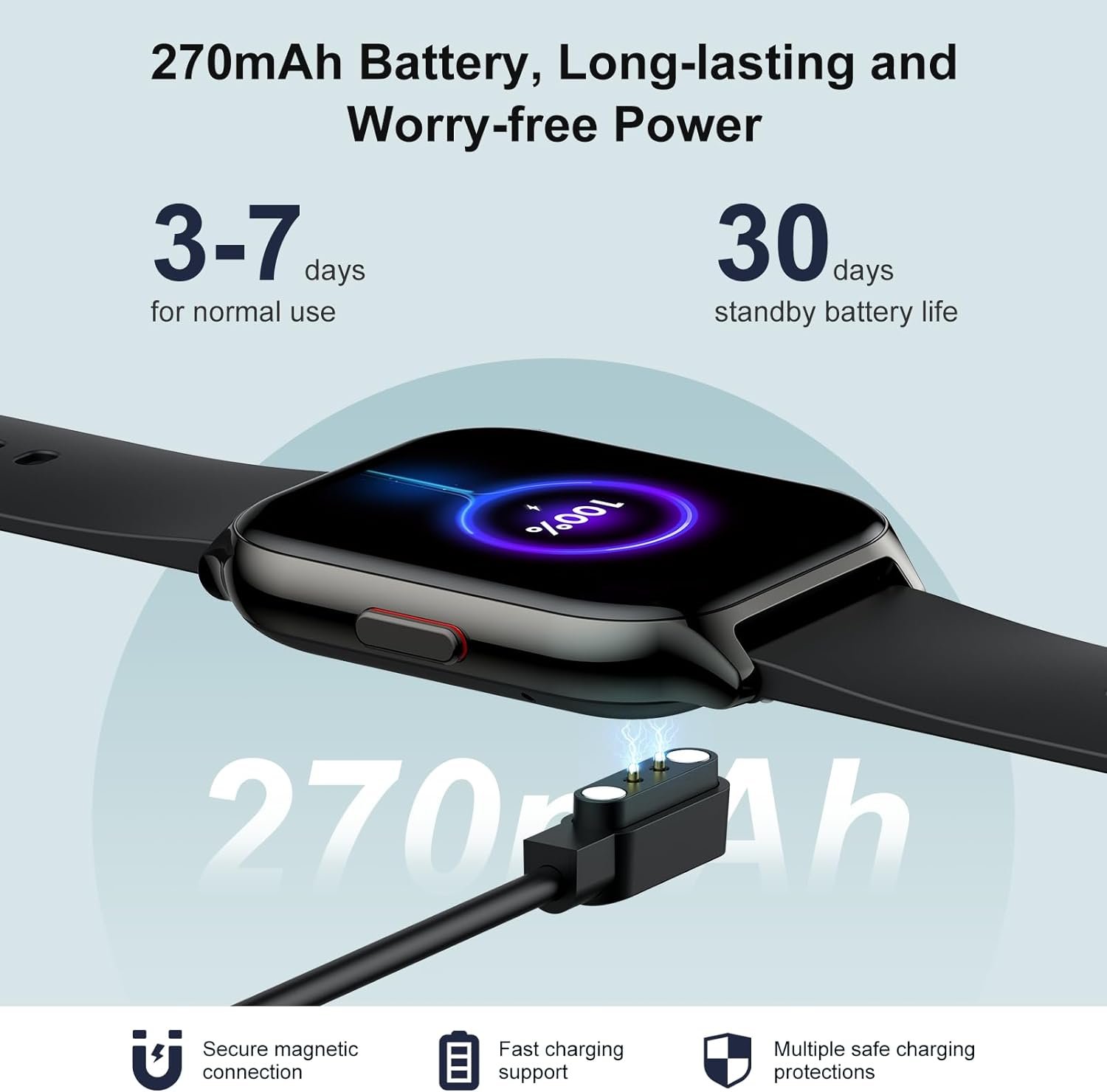 Equipped with an upgraded chip, our smartwatch excels in power efficiency, ensuring optimal usage throughout the day. The 270mAh battery is engineered to provide long-lasting performance without the constant need for recharging. Bid farewell to battery anxiety and embrace the convenience of a watch that keeps pace with your active lifestyle, delivering reliable performance that endures. The magnetic charging method simplifies the charging process, ensuring fast and hassle-free replenishment. With just two hours of charging, you can enjoy 3-5 days of uninterrupted usage.