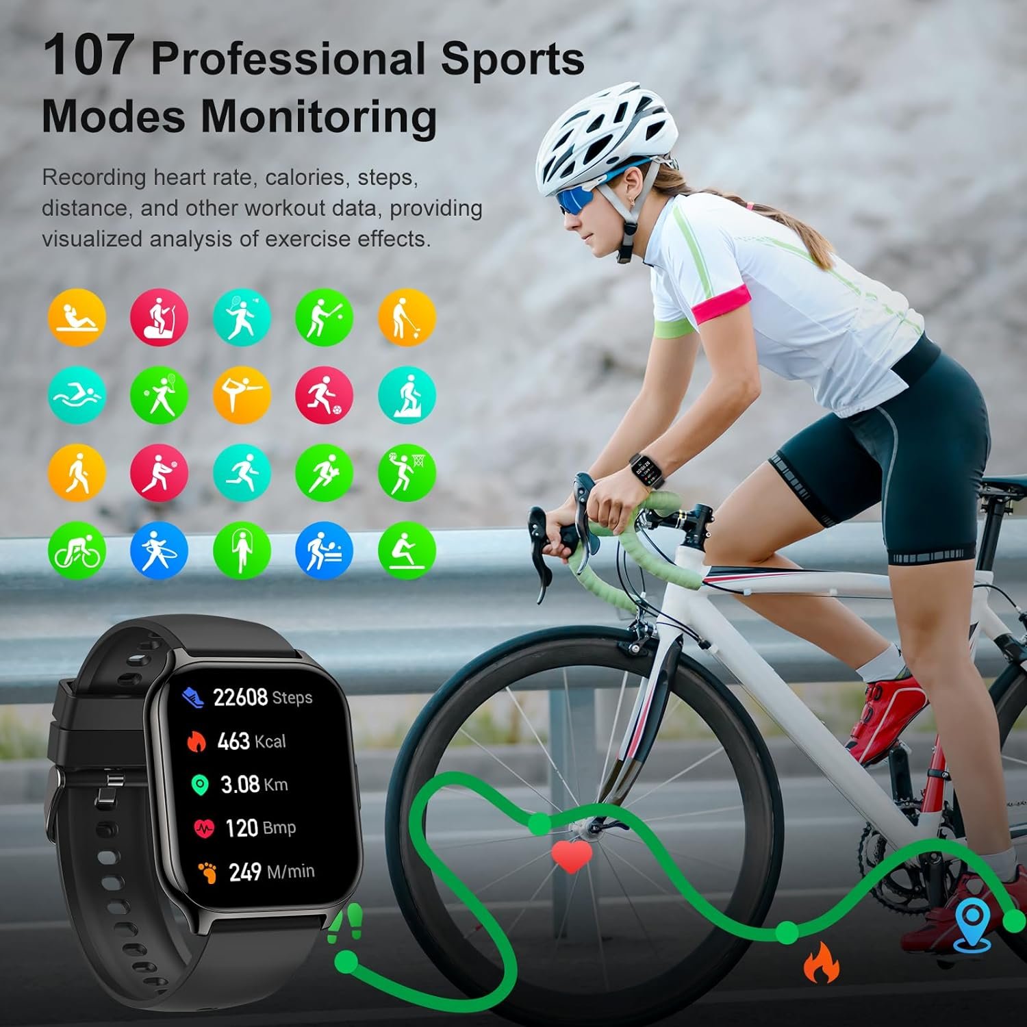 [Multiple Sports Modes & IP68 Waterproof] Supporting over 107 sports modes, the smart watch helps users comprehensively record and track various physical activities. Intelligent tracking of heart rate, calories burned, steps, distance, and cadence provides personalized and accurate data for activities such as running, cycling, swimming, or basketball. The smart watches for men adapt to each activity, visualizing your workout progress and helping you achieve your fitness milestones. With IP68 waterproof rating, it can be used underwater and withstands daily activities like handwashing, face washing, or sweating, ensuring worry-free usage for your daily life and sports needs.