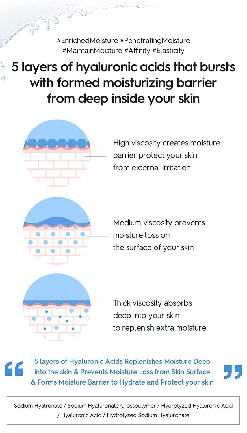 5 HYALURONIC ACIDS: 5 layers of hyaluronic acid replenishes moisture deep into the skin, prevents moisture loss from the skin surface, and forms a moisture barrier to hydrate and protect your skin.