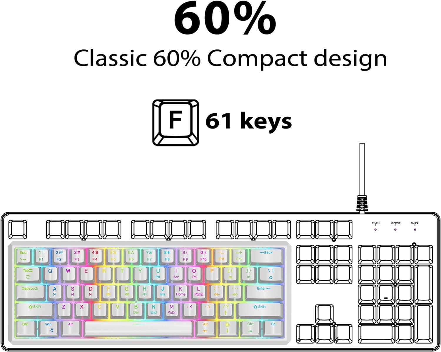 【Classic 60% Small Keyboard】This classic 60 percent mechanical keyboard is ultra-compact. Its small size helps you save space for gaming or work. Its detachable USB-C cable makes it more convenient to carry.