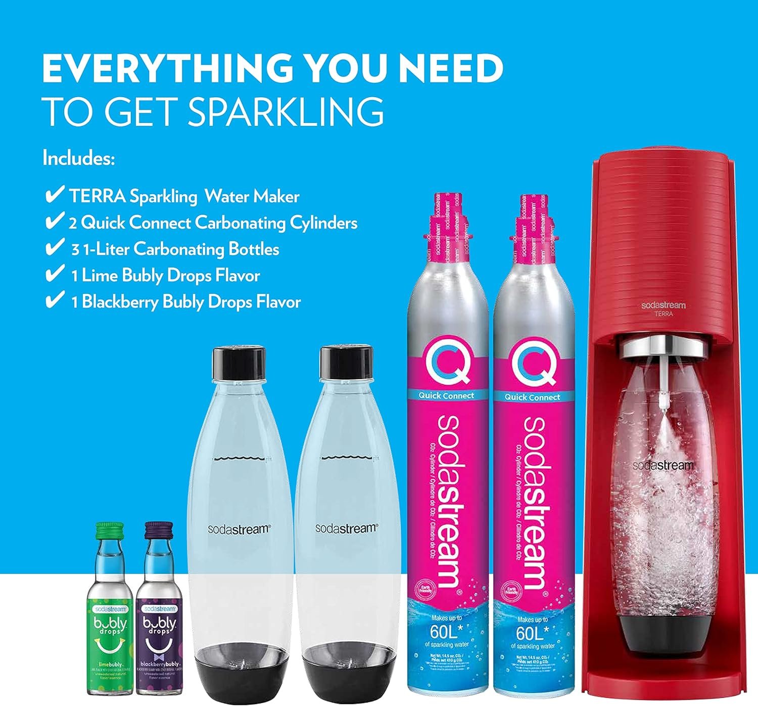 SodaStream Terra Sparkling Water Maker Bundle (Red), with CO2, DWS Bottles, and Bubly Drops Flavors