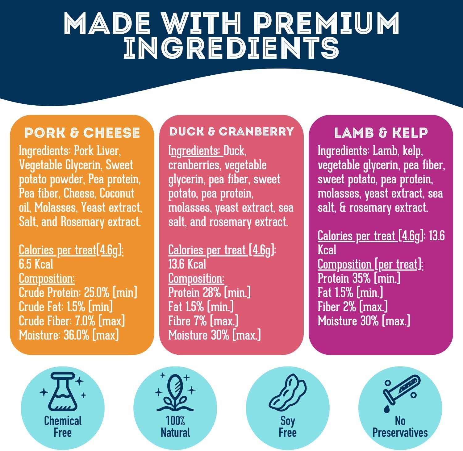 NATURAL TREATS FOR DOGS & CATS HIGH IN PROTEIN IN 3 GREAT FLAVORS – Our treats for dogs are 100% natural, filled with nutrient-rich pork, lamb, and duck meat. Packed with Omega 3s, vitamins and minerals such as Iron, Zinc, and Vitamin D, these cat and dog snacks are chemical-free with zero additives or preservatives, making them the ultimate choice for cat treats and dog treats alike. With these soft and chewy dog treats your furry family will receive the finest in nutritional support!