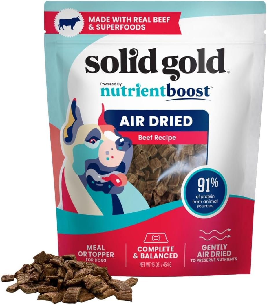 Gently Air Dried & Craveably Delicious! – Solid Gold Air Dried dog food flavor topper recipe is a dog meal topper, holiday dog treat, freeze dried, and kibble alternative made with high protein that is gently air dried to preserve nutrients and flavor