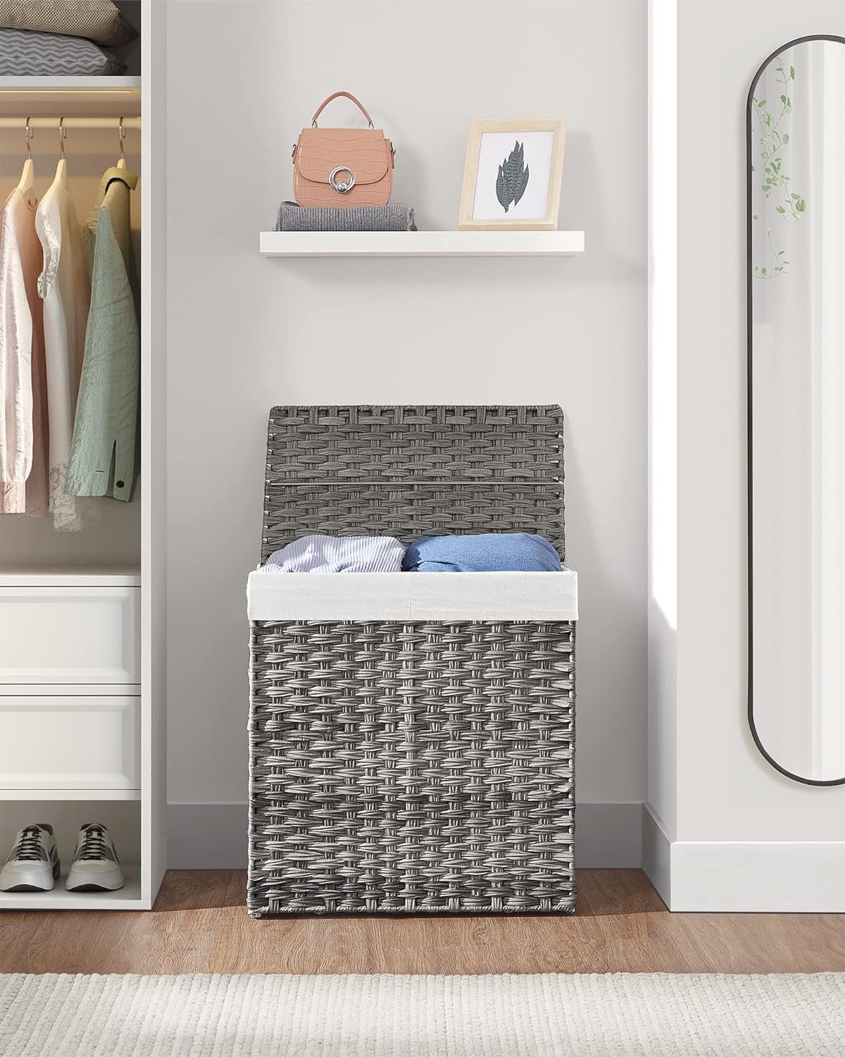 [Stable Steel Frame & Breathable Synthetic Rattan] Crafted with a sturdy steel frame and select synthetic rattan, this laundry hamper with lid is stable, waterproof, breathable, and can stay dry in humid environments