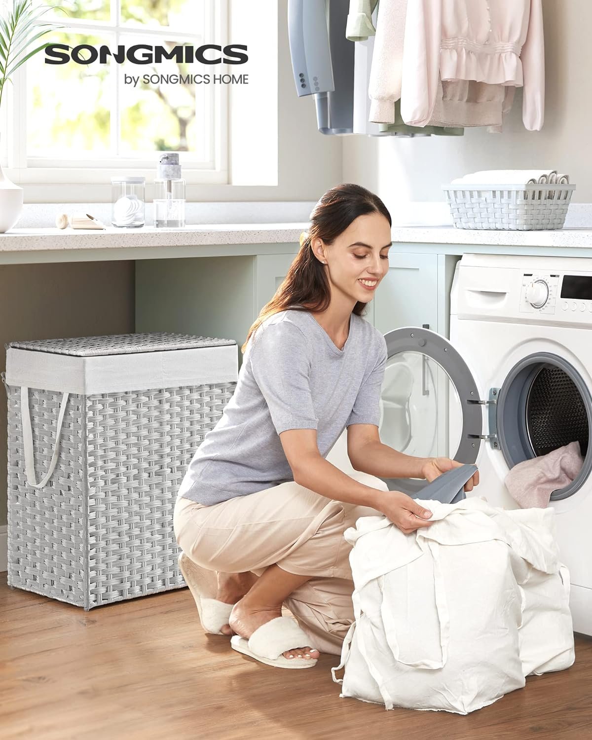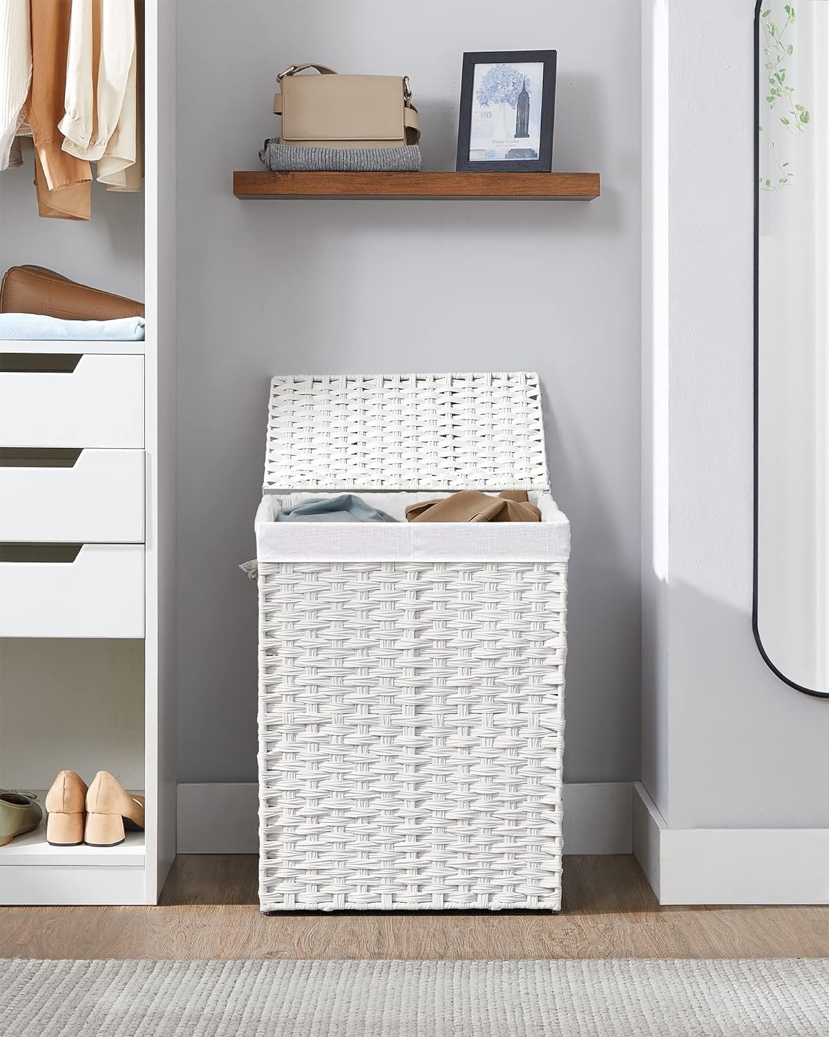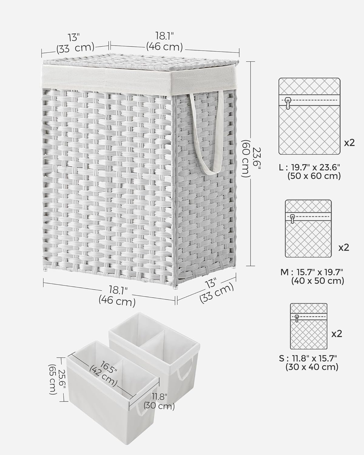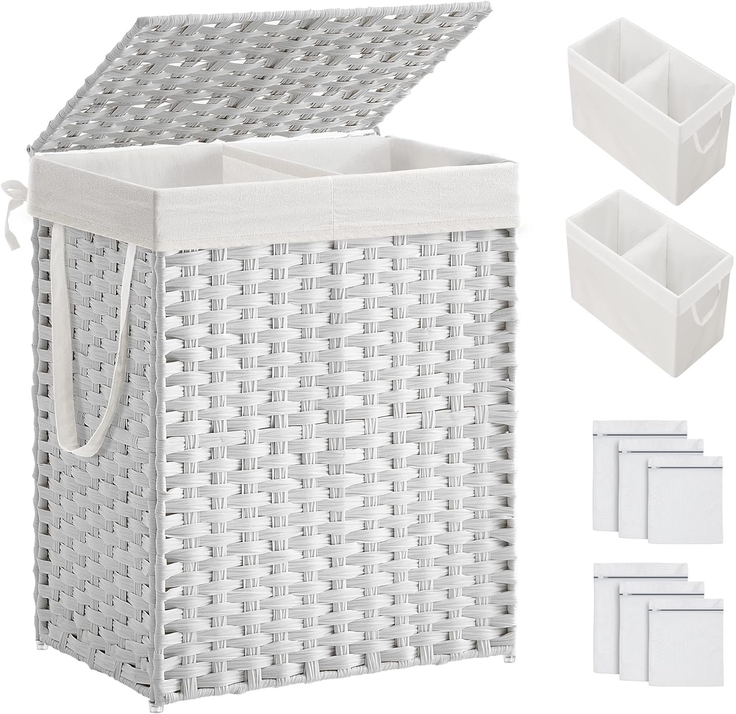 SONGMICS Laundry Hamper with Lid, 90L Clothes Hamper with 2 Removable Liner Bags, 6 Mesh Bags, Wicker Laundry Basket, Double Laundry Hamper for Bathroom, 13 x 18.1 x 23.6 Inches, White ULCB251W01V1