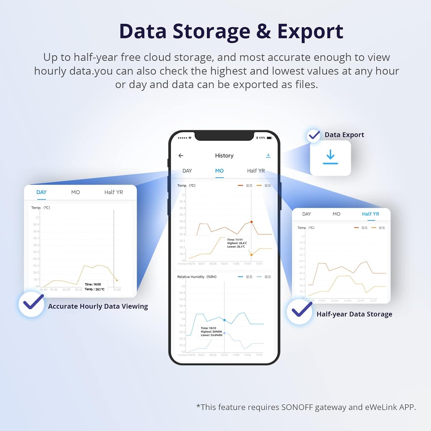 【Data Storage & Export】Up to half-year free cloud storage, and most accurate enough to view hourly data, you can also check the highest and lowest values at any hour or day and data can be exported as files.