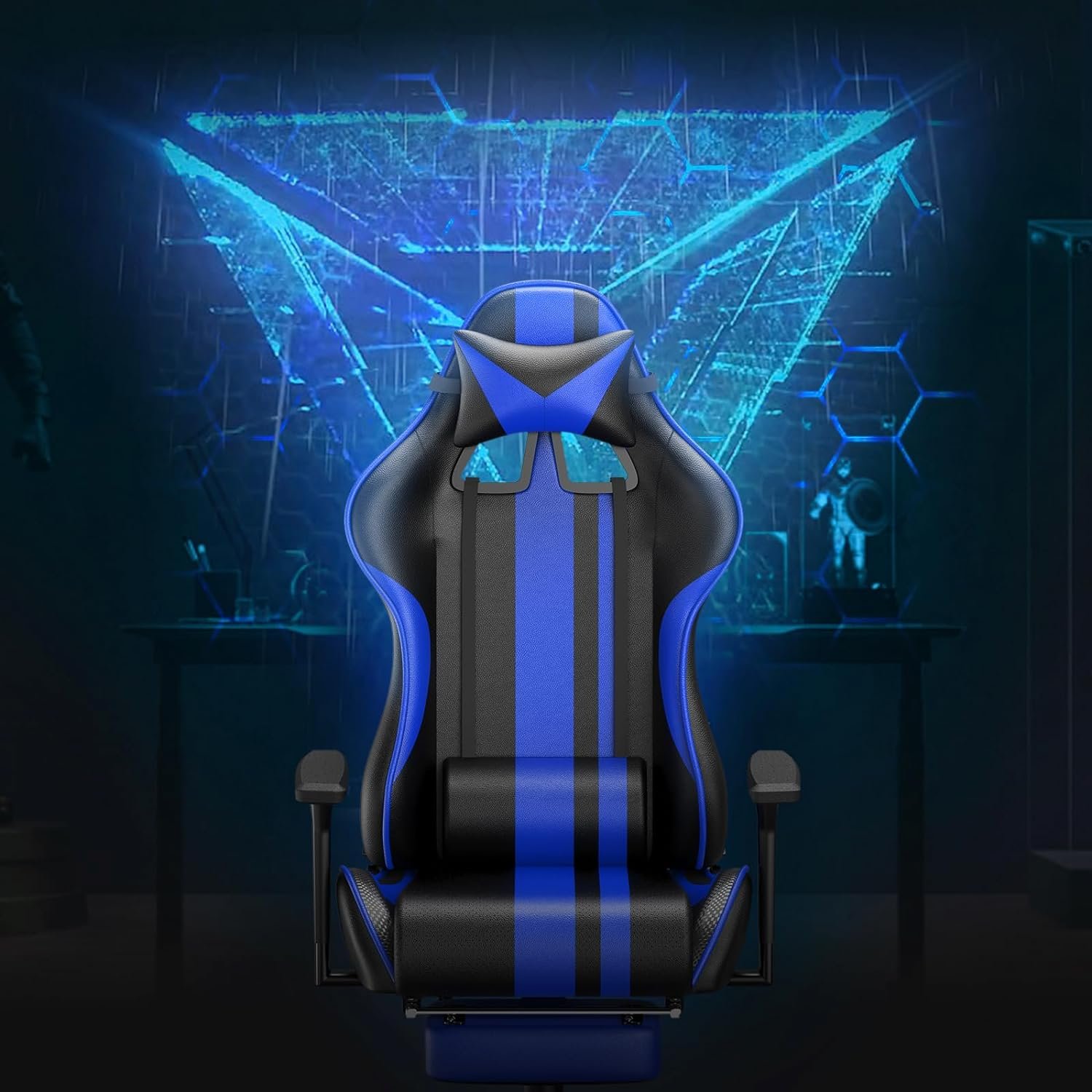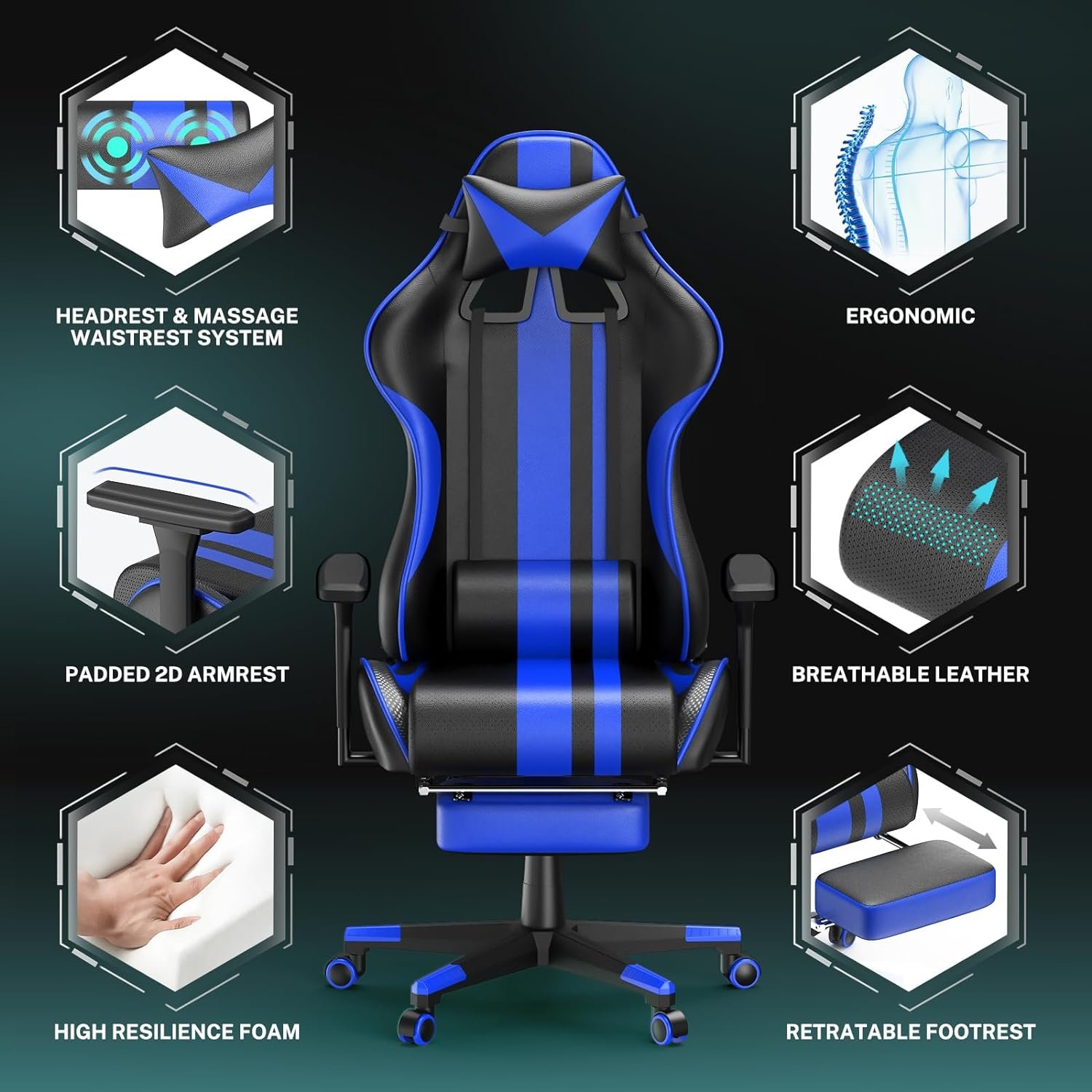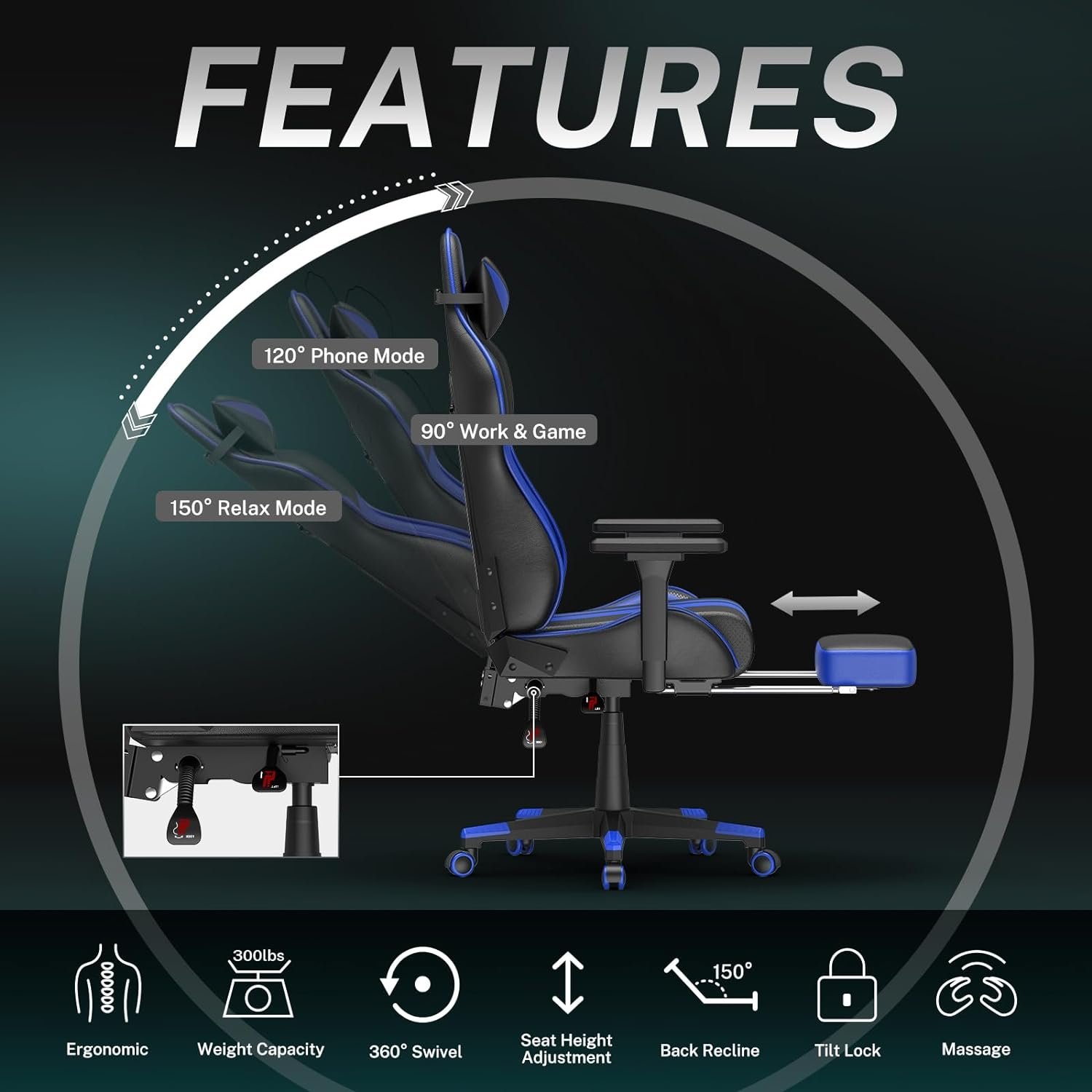 【Ergonomic Reclining Gaming Chair】Following to the human spine curve, the blue game chair with massage is designed with an ergonomic structure. The video game chair comes with a 360-degree swivel, 4-inch height adjustment, 90° to 135° reclining backrest, so you can work or play games all day without feeling tired.