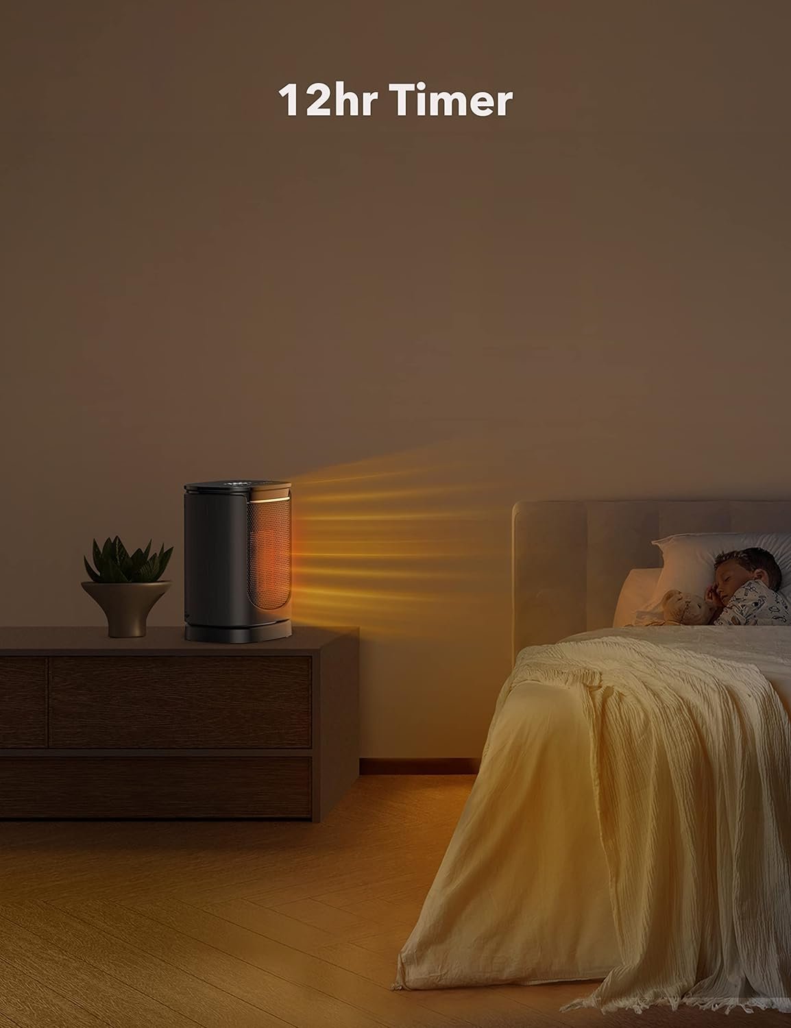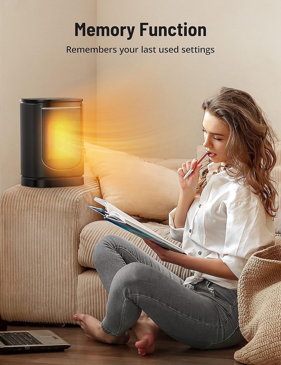 【PORTABLE DESK HEATER】:At only 10in high, this compact portable heater can be placed on your desk or kept by your feet for targeted heat. A hidden handle for easily moving from room to room. The memory function can remember your last settings.