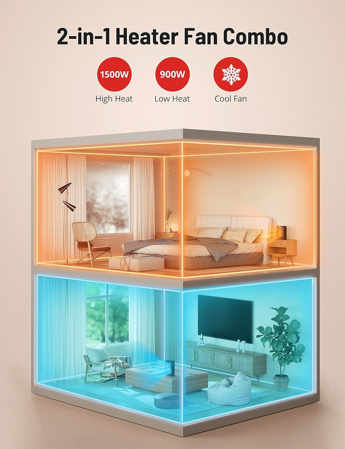 【THREE HEAT SETTINGS WITH FAN 】:High Heat (1500W), Low Heat (750W) and Fan, make this indoor space heater ideal for warming up your personal space in a small home and office. Reduce your energy bills by using this energy-efficient space heater to heat.