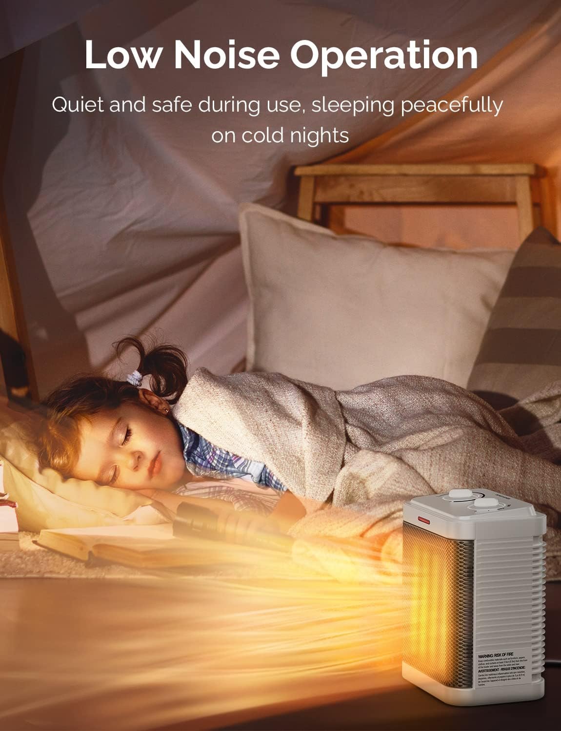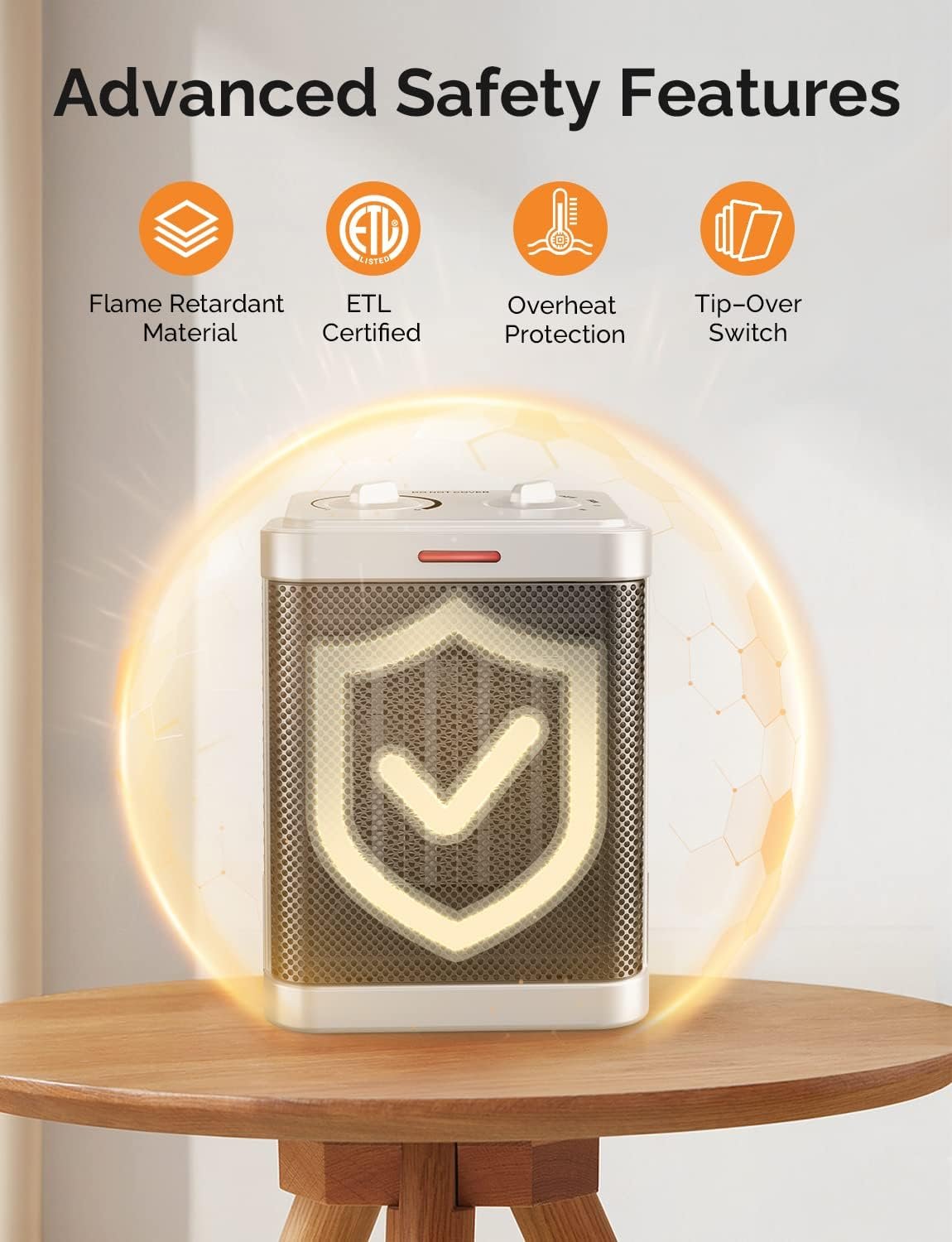 SAFE AND HASSLE-FREE: This tabletop heater features safety features to protect against tip-over and overheating. Made of premium-quality flame retardant material to avoid fire accidents. And certificated by Electrical Testing Laboratories (ETL) USA & Canada. Wraps you in toasty quiet heat all night long.The heating device provides users with a safer and more comfortable operating experience.